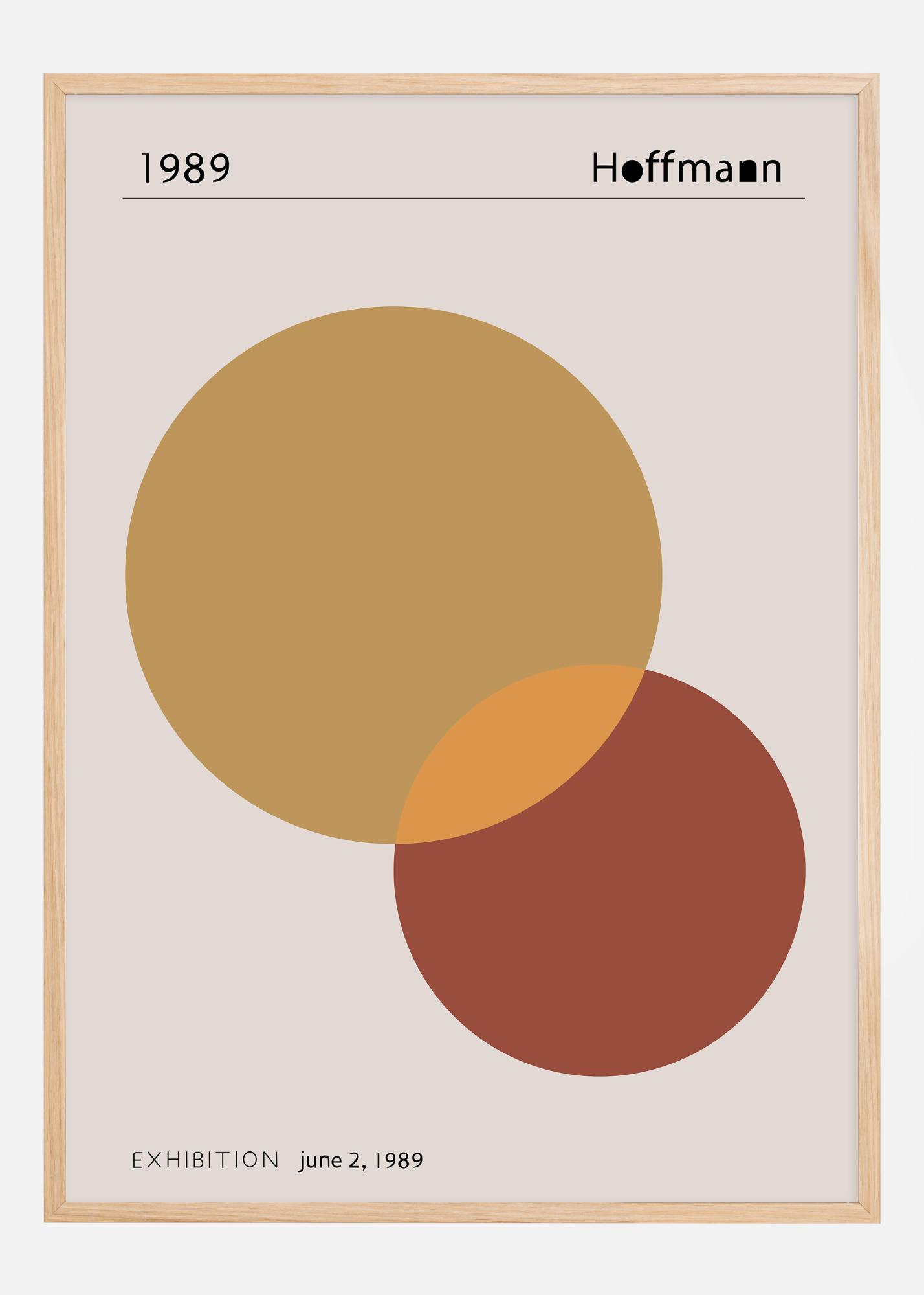 Dieses minimalistische und raffinierte Poster würdigt die Ausstellung des abstrakten Künstlers Hoffmann aus dem Jahr 1989. Mit einem eleganten Design aus sich überlappenden Kreisen in warmen Tönen von Braun und Ocker verleiht dieses Poster sowohl ein Gefühl von Retro als auch von Modernität. Der Text ist dezent platziert, um den visuellen Elementen Raum zu geben, wobei jedes Element sorgfältig ausbalanciert ist, um ein stimmungsvolles und einladendes Kunstwerk zu schaffen.