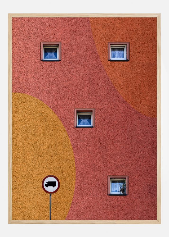 Dieses zeitgenössische Poster ist eine Hommage an architektonischen Minimalismus und Verspieltheit, perfekt für den modernen Innenarchitektur-Enthusiasten. Das Bild zeigt eine exquisite Komposition einer Gebäudefassade in kräftigen roten und gelben Tönen, mit vier Fenstern in symmetrischer Anordnung, die durch ein unregelmäßig platziertes fünftes Fenster gebrochen wird. Jedes Fenster ist in tiefes Blau eingerahmt, das stark gegen den warmen Hintergrund kontrastiert. Ein Straßenschild mit einem LKW-Symbol fügt der Komposition einen Hauch von urbanem Realismus hinzu.