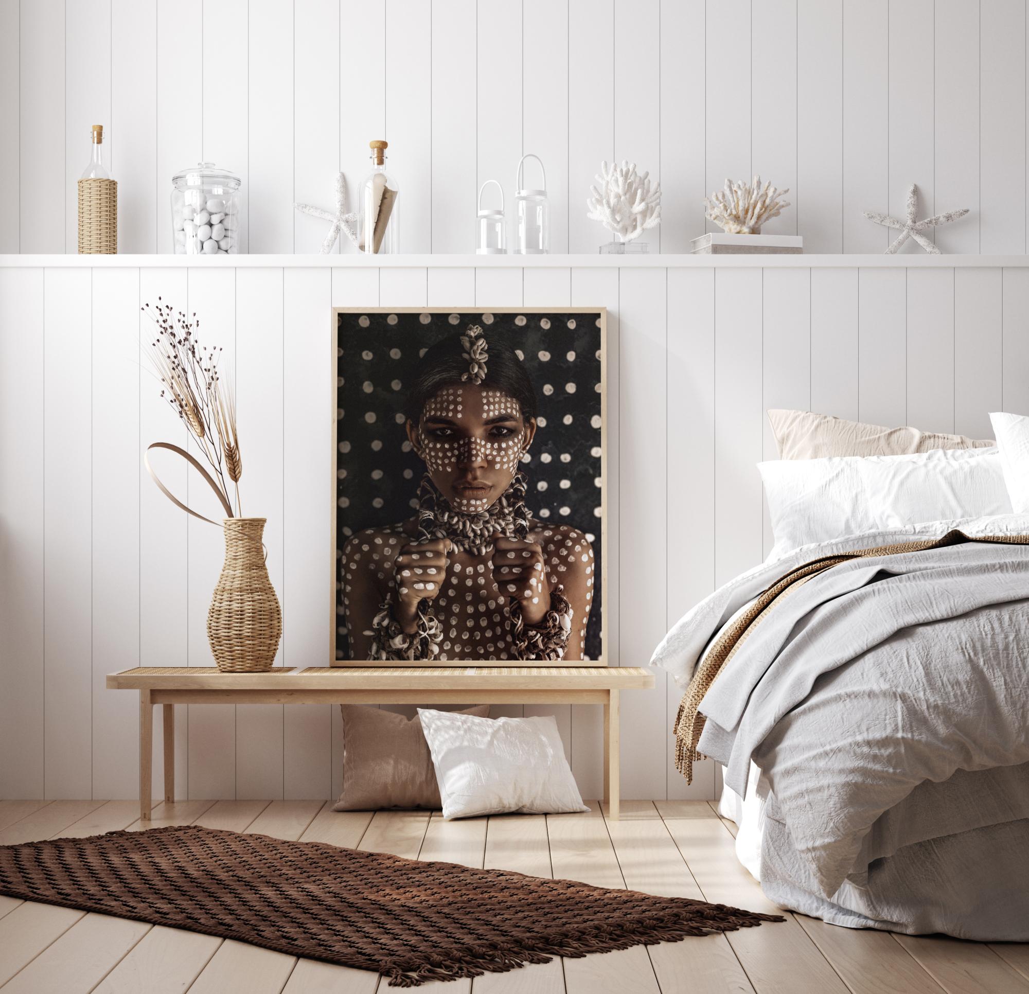 Hier wirst du von einem festen Blick einer jungen weiblichen Aborigine mit weißer Körperbemalung und schönen Schmuckstücken aus Naturfaden und Muscheln empfangen. Ein erdverbundenes Fotokunst poster, das sich sowohl in einsamer Majestät als auch an der modernen Bildwand gut macht.