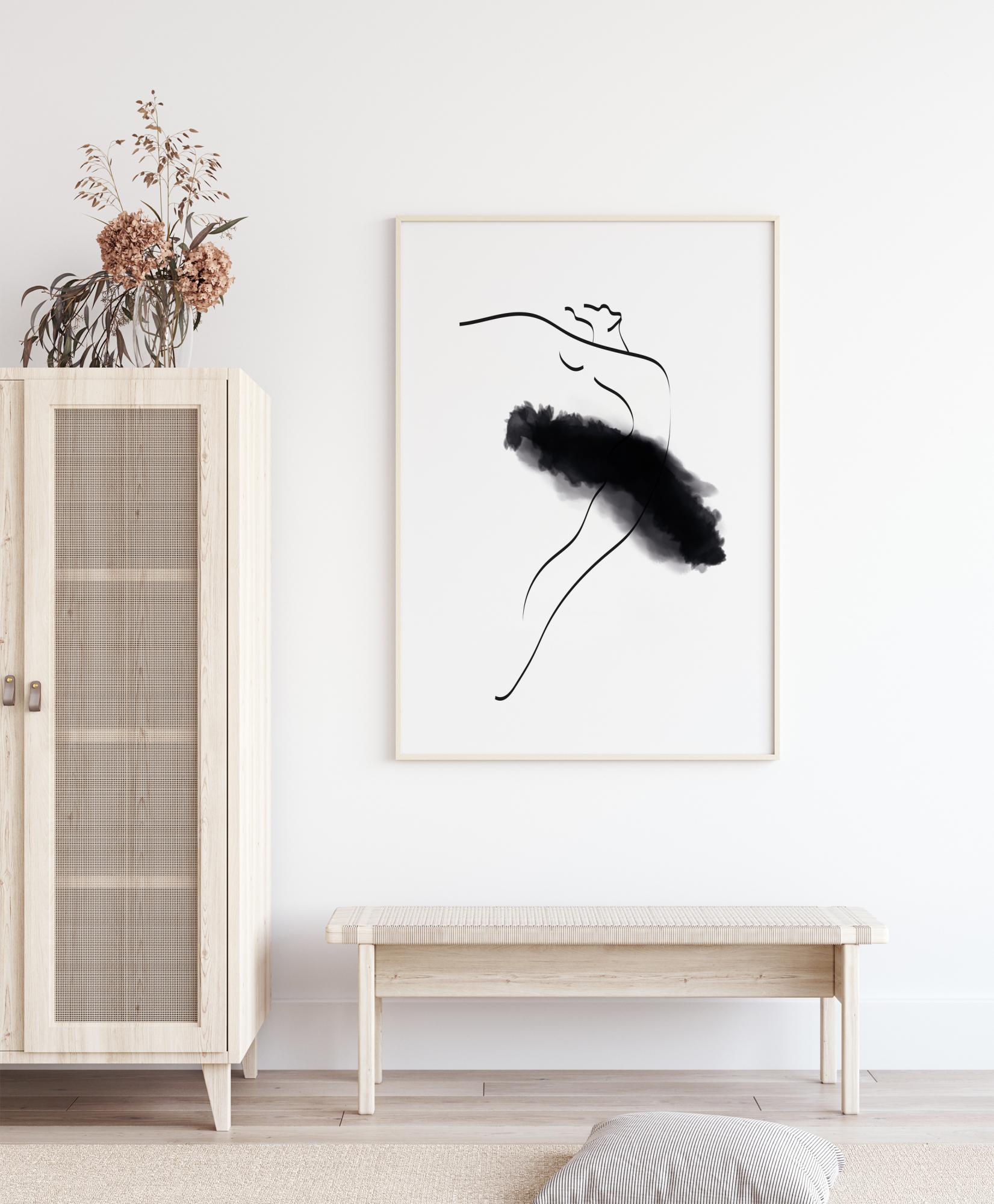 Eine Aquarellzeichnung einer Ballerina in dünnen schwarzen Linien mit einem ausgeprägteren schwarzen Ballerinarock. Ein minimalistisches und stilvolles Poster, das sowohl im Schlafzimmer oder Flur als auch im Wohnzimmer oder in der Bibliothek gut passt.