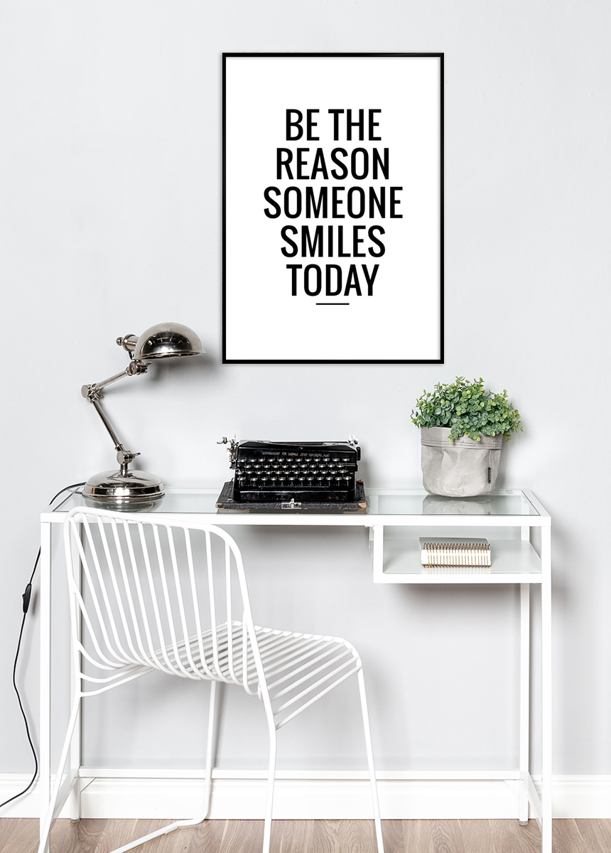 Was ist das Schönste, was du als Mitmensch für einen anderen tun kannst? Natürlich gibt es eine Reihe verschiedener Taten zur Auswahl, aber letztendlich ist es das Lächeln, das du als Antwort erhältst, das am wichtigsten ist! Dieser stilvolle print bietet eine schöne und wichtige Orientierung im Alltag. Das poster ist weiß und hat einen schwarzen Druck mit dem Text „Be the reason someone smiles today“. Da es schwarzweiß ist, lässt es sich vorteilhaft mit deinen Lieblingsfarben für Rahmen oder Passepartout kombinieren. Erhältlich in 6 verschiedenen Größen und Preisklassen.