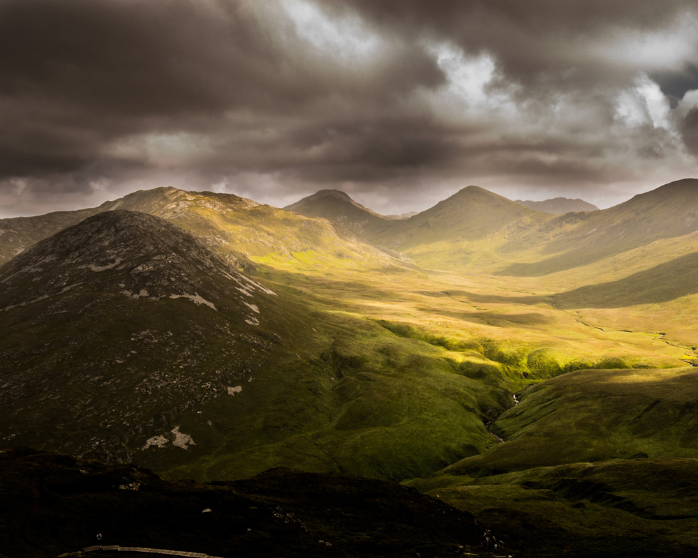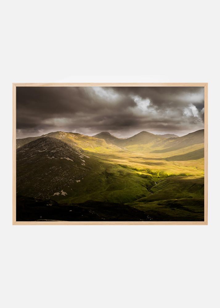 Dramatisches Landschaftsporträt mit aufziehenden Sturmwolken über einer Bergkette, während die Sonne das Tal unten erleuchtet. Gedämpfte, matte Farben betonen das Dramatische des Bildes und lassen das Foto wirklich hervorstechen. Passt am besten in einen Rahmen, der die Tiefe des Bildes hervorhebt und nicht die Aufmerksamkeit vom Motiv stiehlt.