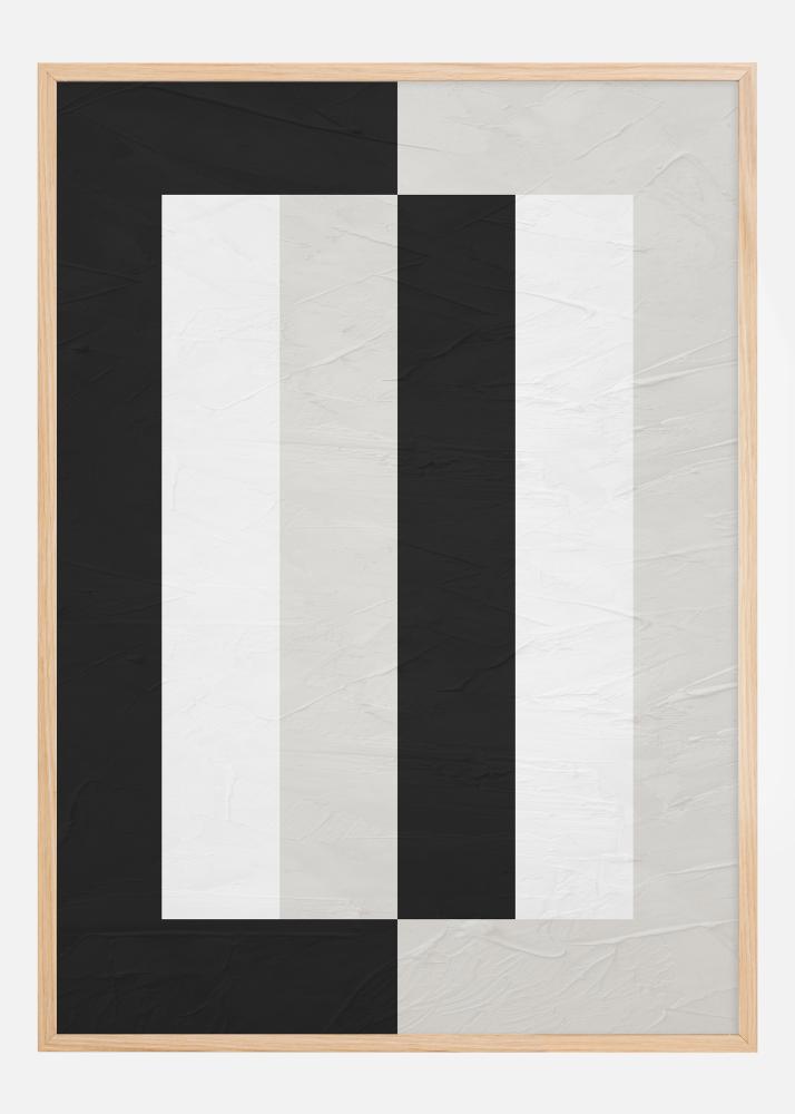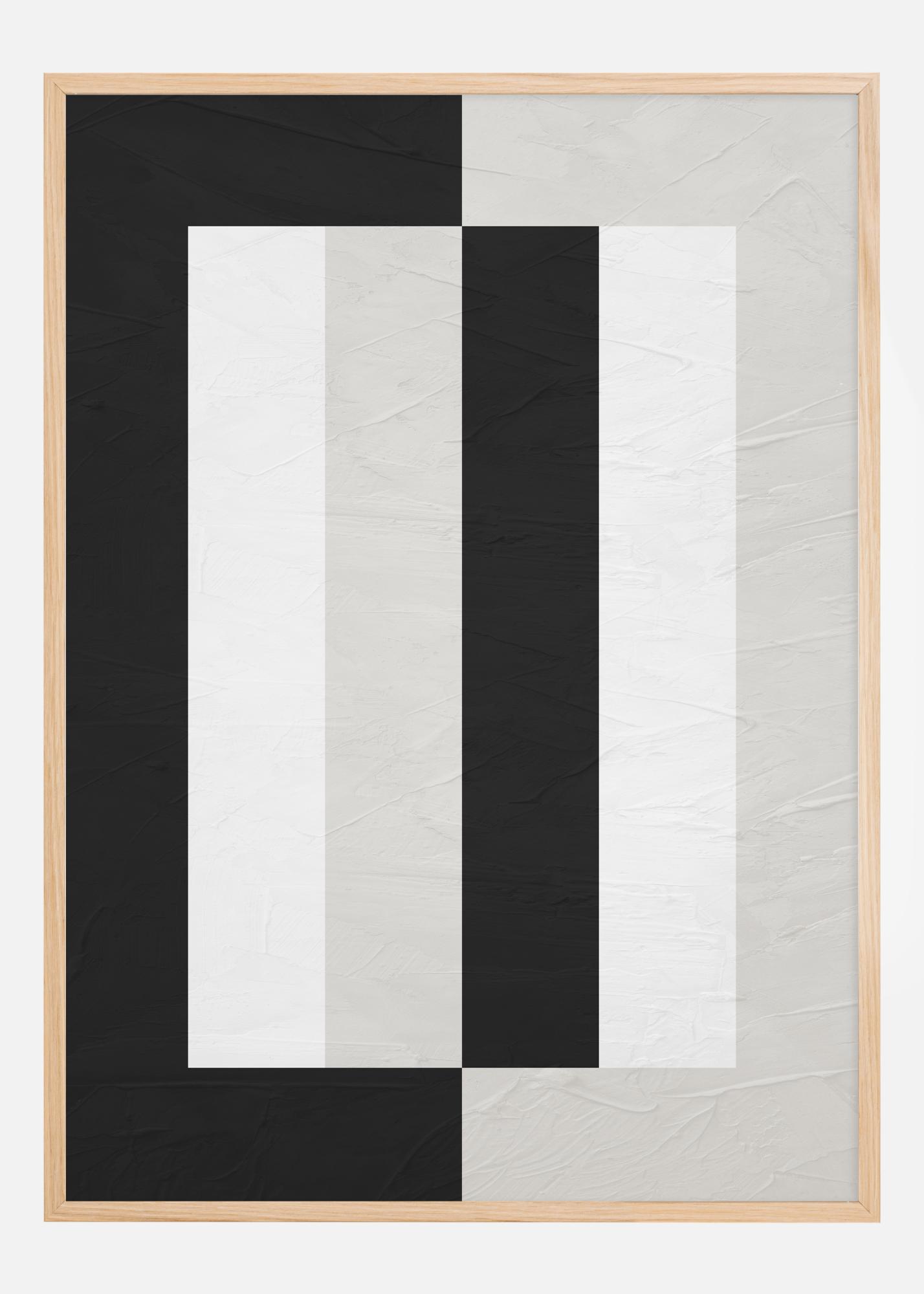 Dieses anspruchsvolle Poster präsentiert eine mutige und grafische Komposition, die sofort die Aufmerksamkeit des Betrachters auf sich zieht. Die kontrastreiche Kombination von Schwarz und Weiß bildet eine Serie vertikaler Linien und Blöcke, die eine optische Illusion von Tiefe und Bewegung erzeugen. Dieses Plakat ist ideal für den modernen Innenarchitekten, der nach einem Kunstwerk sucht, das ein Gefühl von Eleganz und zeitgenössischem Design vermittelt. Die strenge Farbpalette macht es einfach, dieses Bild in verschiedenen Räumen und Umgebungen zu integrieren.