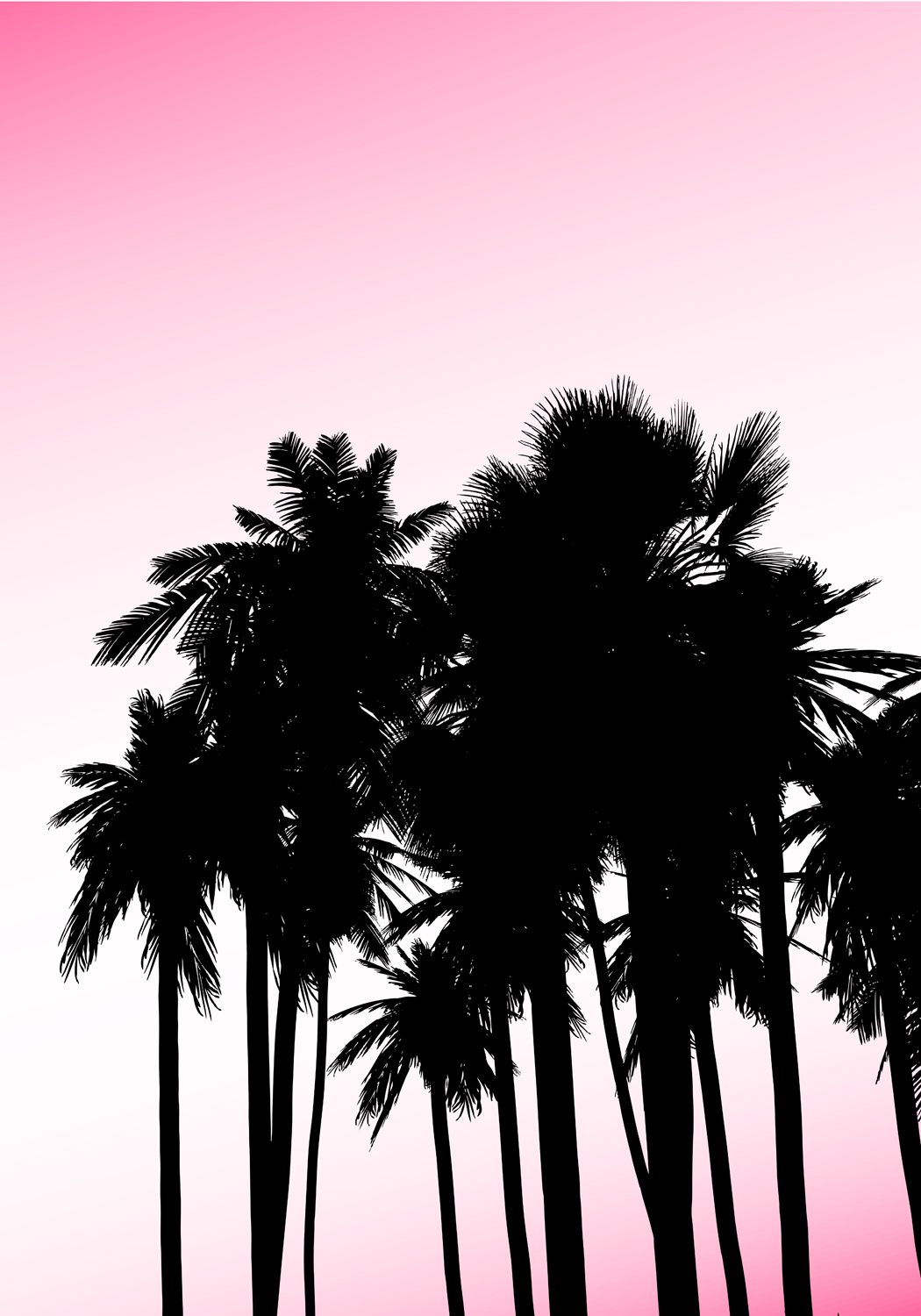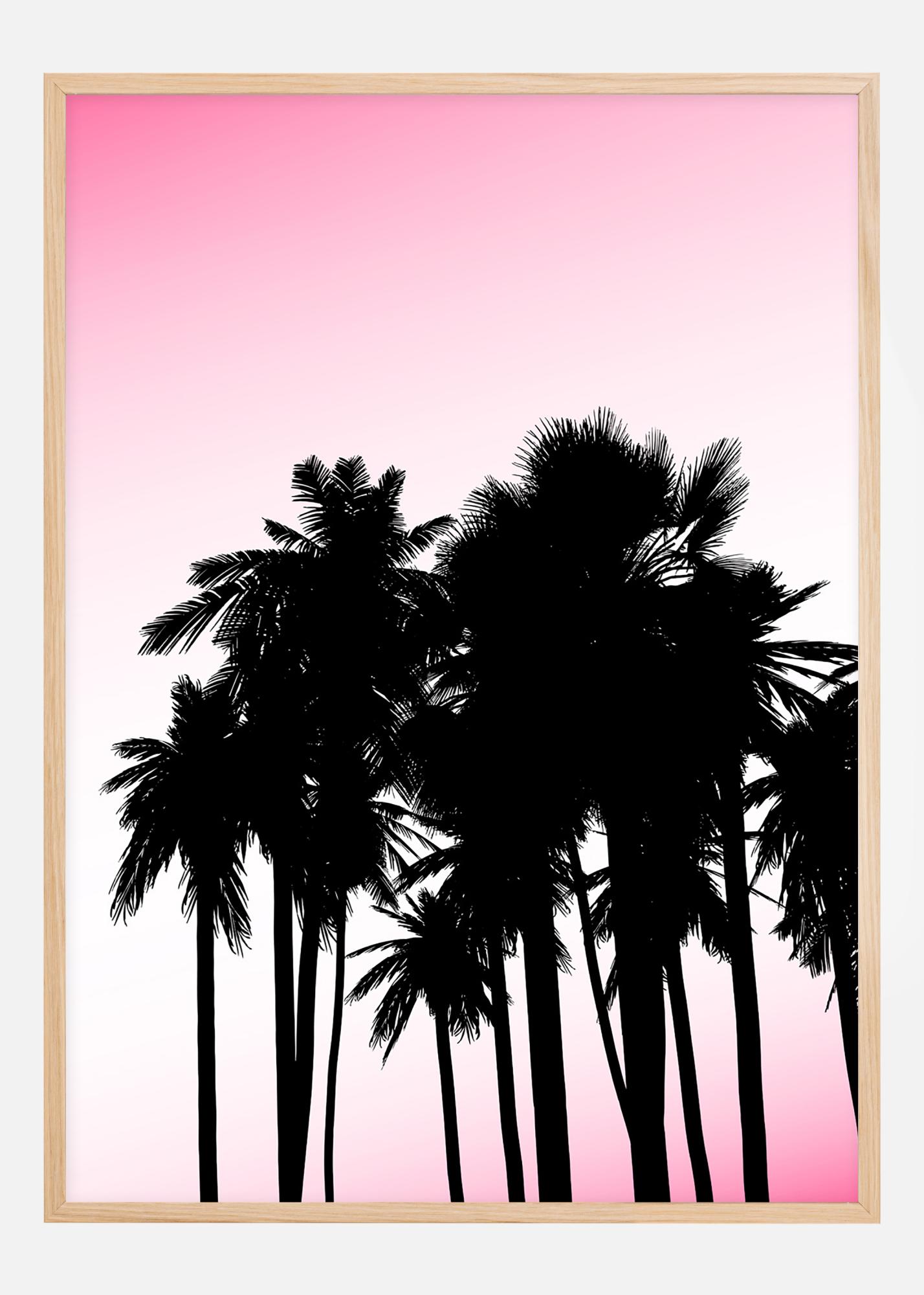 Ansprechendes plakat mit Palmen vor einem rosa Himmel, das ein Gefühl vermittelt, als wäre man auf der Strandpromenade in Miami. Das Motiv passt sowohl in eine glamouröse Einrichtung mit einem Hauch von Art Deco in einem Goldrahmen als auch in eine moderne Einrichtung, gerahmt in einem schwarzen, dünnen Rahmen. Das poster macht sich gut alleine an einer Wand mit Accessoires vom Strand und zusammen mit anderen grafischen print auf einer größeren Bildwand, die zum Blickfang im Raum wird.