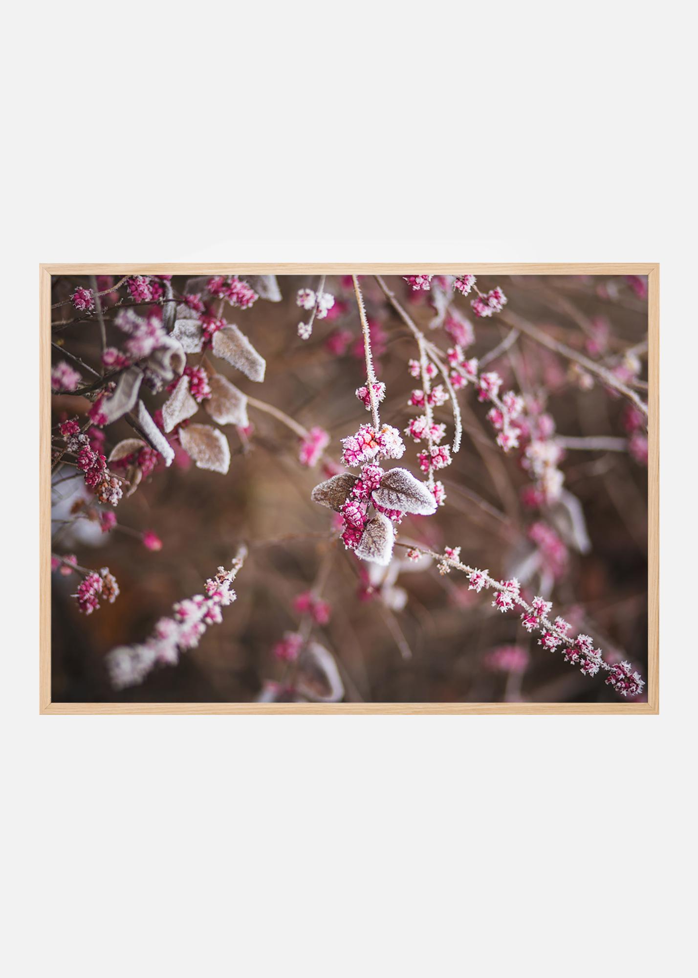 Fotokunst mit Nahaufnahme von frostigen, tauigen Beeren mit geringer Schärfentiefe. Der Druck erzeugt mit den Beeren in Rosa und dem Hintergrund in Schokoladentönen ein warmes und gemütliches Gefühl. In einer größeren Größe mit einem schicken Rahmen wird das Bild zum Blickfang im Wohnzimmer oder setzen Sie eine kleinere Variante im Bildercollage zusammen mit anderen poster in denselben Farbtönen.