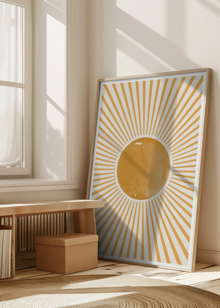 Dieses lebendige Poster beschwört das Gefühl einer strahlenden Sonne herauf, mit seinen ausstrahlenden Linien in Goldtönen, die einen zentralen gelben Kreis auf einem weichen weißen Hintergrund umgeben. Das Design ist inspiriert von bohemischen und geometrischen Mustern, die zusammen das Bild von Wärme und Energie der Sonne erzeugen. Die warmen Farben und das strahlende Muster sind darauf ausgelegt, ein Gefühl von Freude und Positivität zu vermitteln.