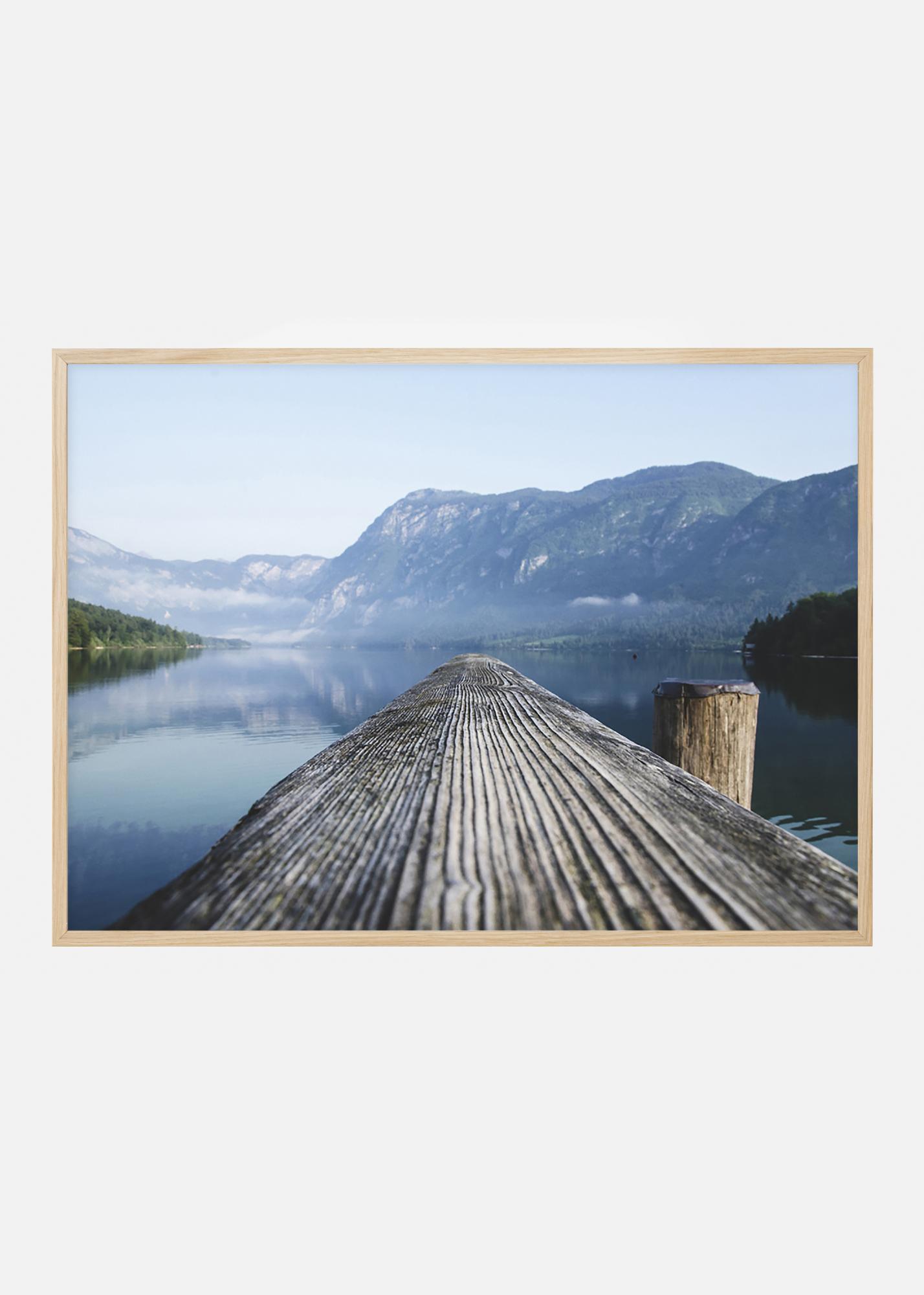 Ausblick auf eine großartige Fjordlandschaft von einem verwitterten Steg. Landschaftsdruck in blauen Tönen, der sowohl als einzelnes Bild an der Wand als auch zusammen mit maritimen Accessoires oder anderen Bildern gut passt. Ergänzen Sie es mit einem grauen Holzrahmen, um die Farben im Bild zu verstärken, oder einem dünneren schwarzen Rahmen für einen minimalistischeren Ausdruck.