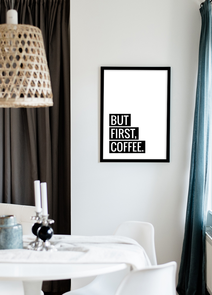Reise um die Welt, gründe ein eigenes Unternehmen, lerne zu jonglieren, während du auf einem superdünnen Seil balancierst! Aber zuerst – Kaffee. Dieses stilvolle poster passt zu dir, wenn du das wunderbare Getränk als einen wichtigen Teil des Alltags siehst. Hänge es über den Küchentisch oder im Büro auf! Das plakat ist weiß mit dem Text „But first, coffee“ in Weiß auf schwarzem Hintergrund. Das schwarz-weiße Design funktioniert ausgezeichnet zusammen mit einem Rahmen oder Passepartout in einer spannenden Farbe. Wähle zwischen 6 verschiedenen Formaten.