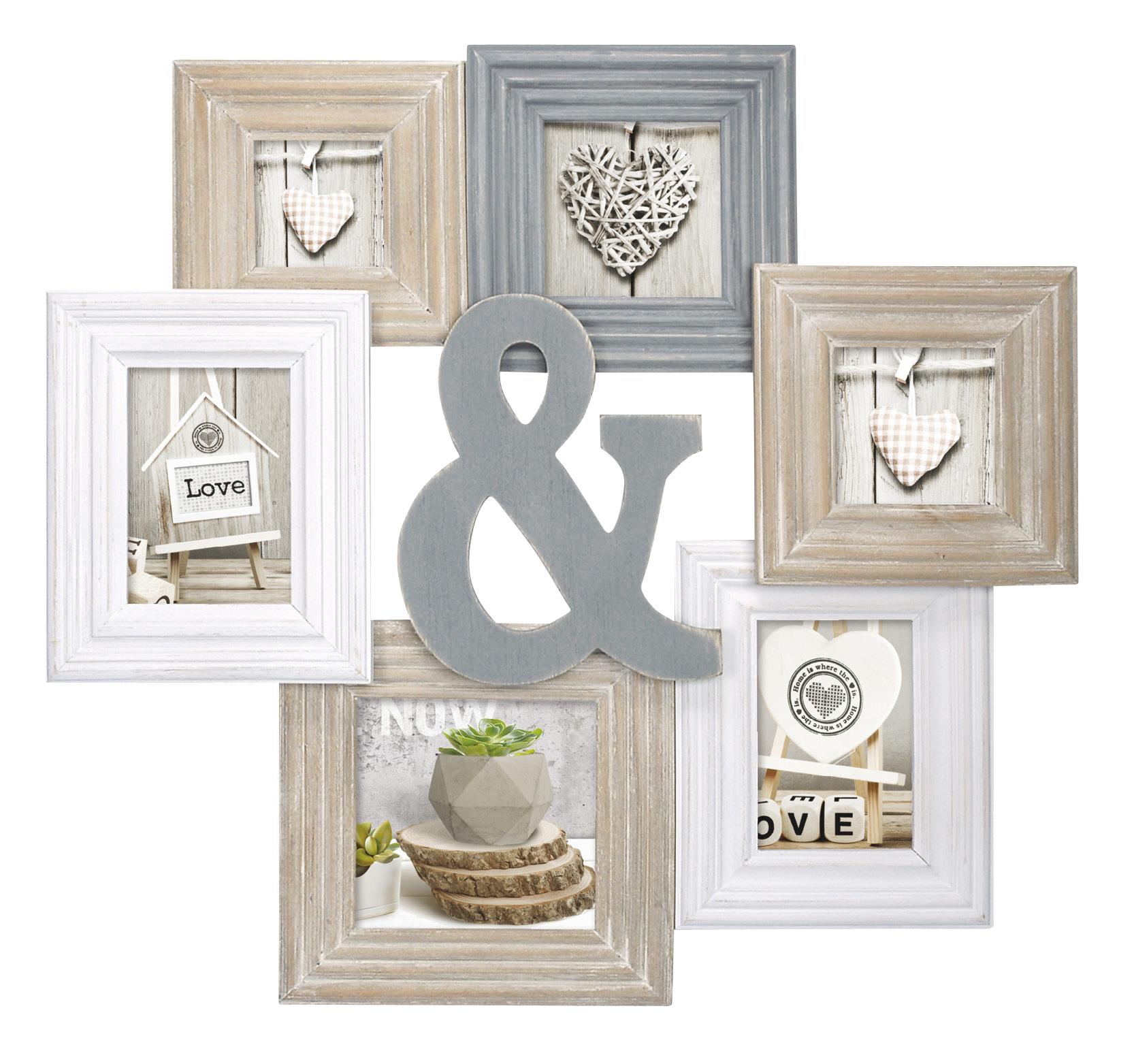 Fällt es dir schwer, zu entscheiden, welche deiner Lieblingsbilder du einrahmen und an die Wand hängen möchtest? Kein Problem! Dieser stilvolle Collage-Rahmen bietet Platz für bis zu 6 schöne Fotos in verschiedenen Formaten. Die Bilderrahmen haben breite, klassische Profile und sind in den Farben Natur, Grau und Weiß gehalten. In der Mitte sitzt ein großes grau gestrichenes &-Zeichen. Die Holzoberflächen wurden so bearbeitet, dass sie abgenutzt und gealtert aussehen.