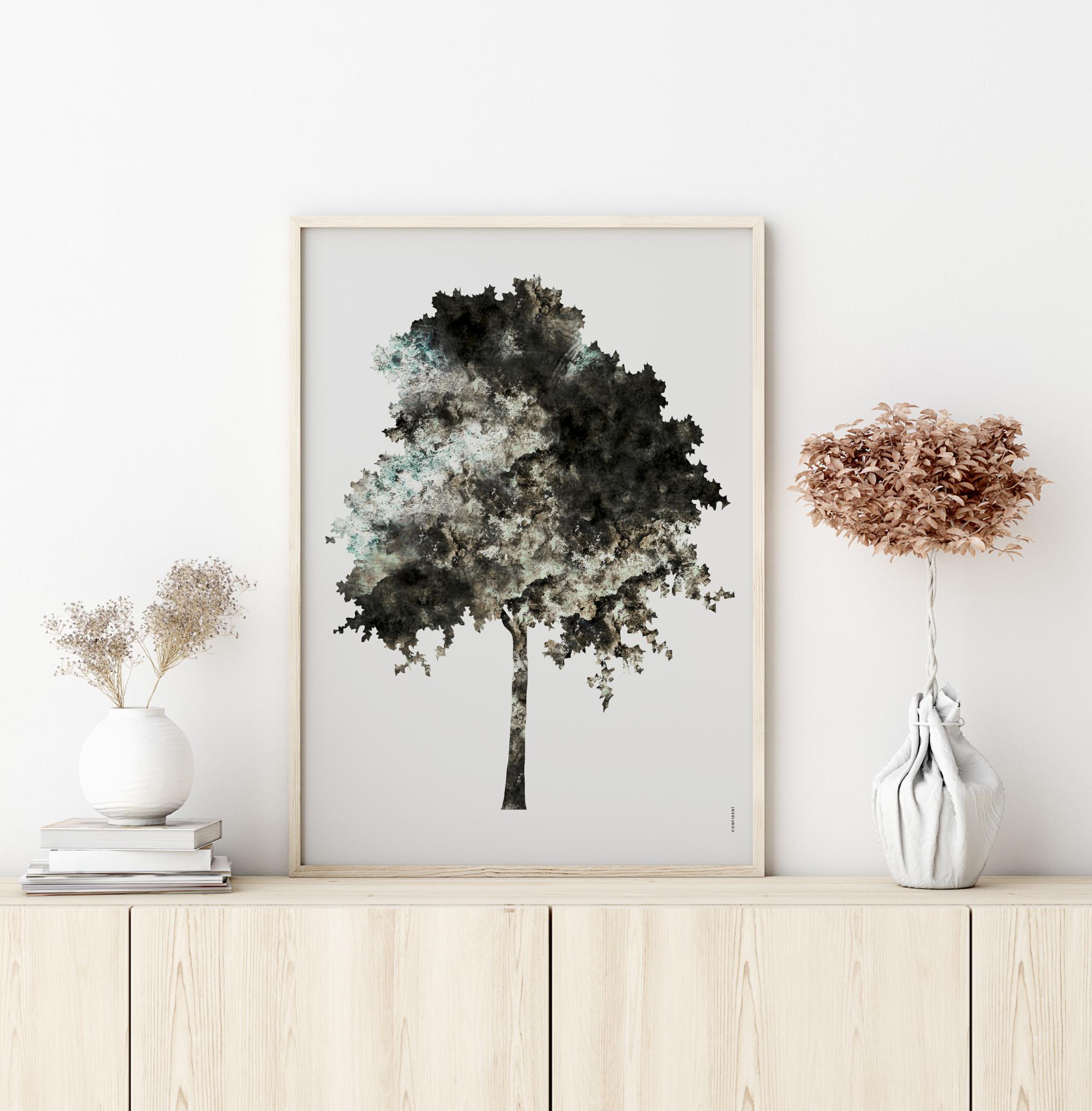 Ein grafischer Kunst poster in Form eines Baumes, erstellt von der Grafikdesignerin Isabell Larsson, VISSLA Visuell Design. Ein herrlich minimalistisches Bild in harmonischen Farben, das sowohl im Flur oder in der Küche als auch im Wohnzimmer, Schlafzimmer oder Bibliothek gut passt.