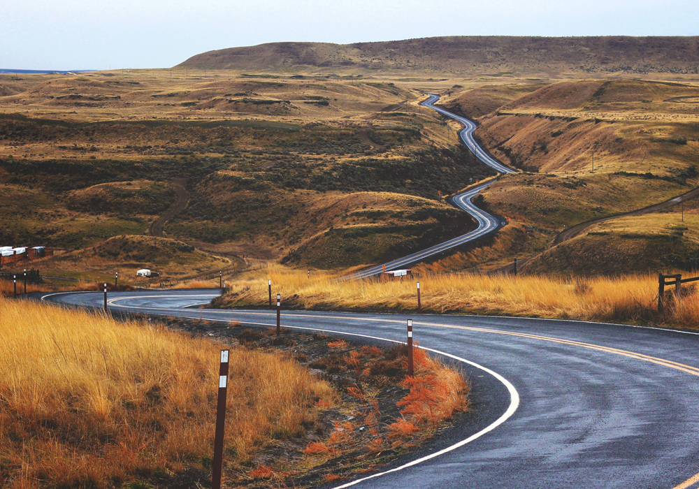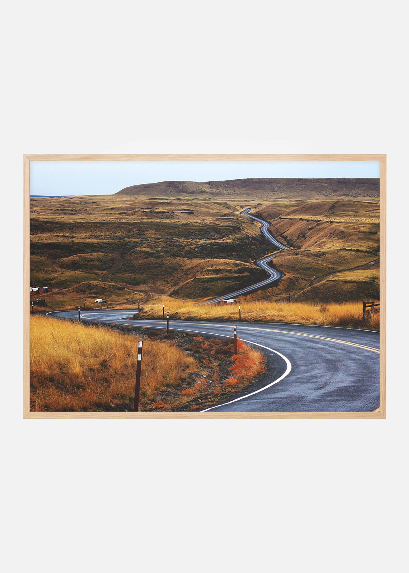 Poster mit einer Asphaltstraße, die sich durch eine sonnenverbrannte Steppe schlängelt. Die gelbbraunen Grasnuancen gegen die kalte Oberfläche des Asphalts, die sich durch die offene Landschaft bricht, ziehen den Blick in das Bild und folgen der Straße. Das Plakat passt gut in einen minimalistischen Rahmen, in dem das Motiv zur Geltung kommt und kann gerne mit anderen Bildern zu einem Thema kombiniert werden.