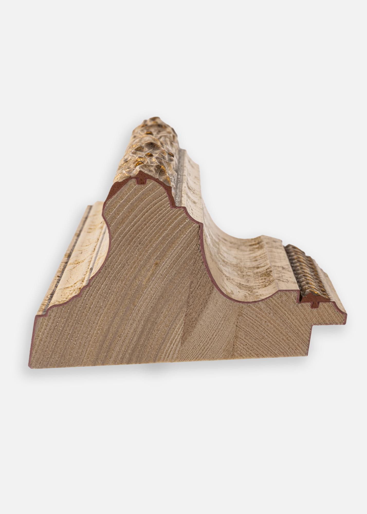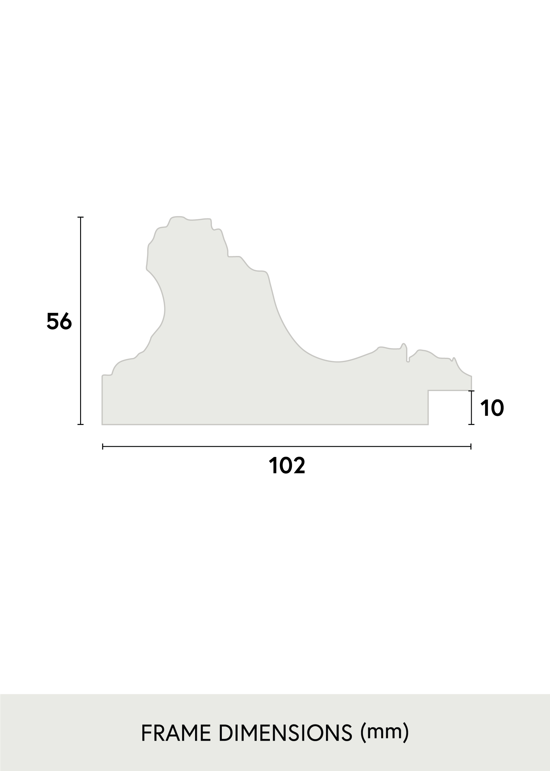 Das breite Profil von 102 mm verleiht dem Rahmen eine beeindruckende Präsenz, während seine Tiefe von 56 mm eine robuste und stabile Einrahmung schafft. Die kleinen perlenförmigen Ornamente entlang der Innenkante verleihen eine subtile, klassische Note, die den Gesamteindruck unterstreicht. Der Außenrand ist mit einem fließenden Blattmuster verziert, was dem Rahmen einen anspruchsvollen und zeitlosen Charakter verleiht.