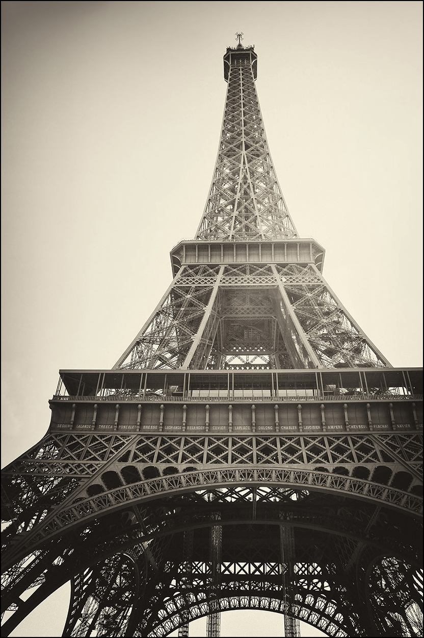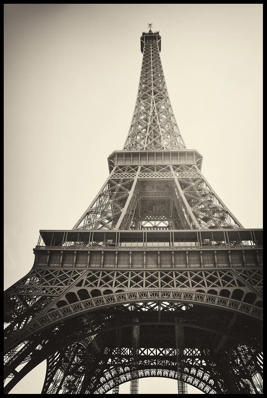 Fantastisches schwarzweißes Foto vom Eiffelturm in Paris, aus der Froschperspektive aufgenommen. Der Detailreichtum des Bildes lässt die eiserne Fachwerkkonstruktion des Turms deutlich erkennen und sorgt für ein interessantes Motiv, das man ausgiebig studieren kann. Das Poster lässt sich ebenso gut in einem Wartezimmer wie an einer Bildwand im Wohnzimmer mit anderen Motiven aus der Hauptstadt der Mode und Gastronomie aufhängen. Komplettieren Sie das Bild mit einem schwarzen Bilderrahmen, der das Motiv gut hervorhebt.