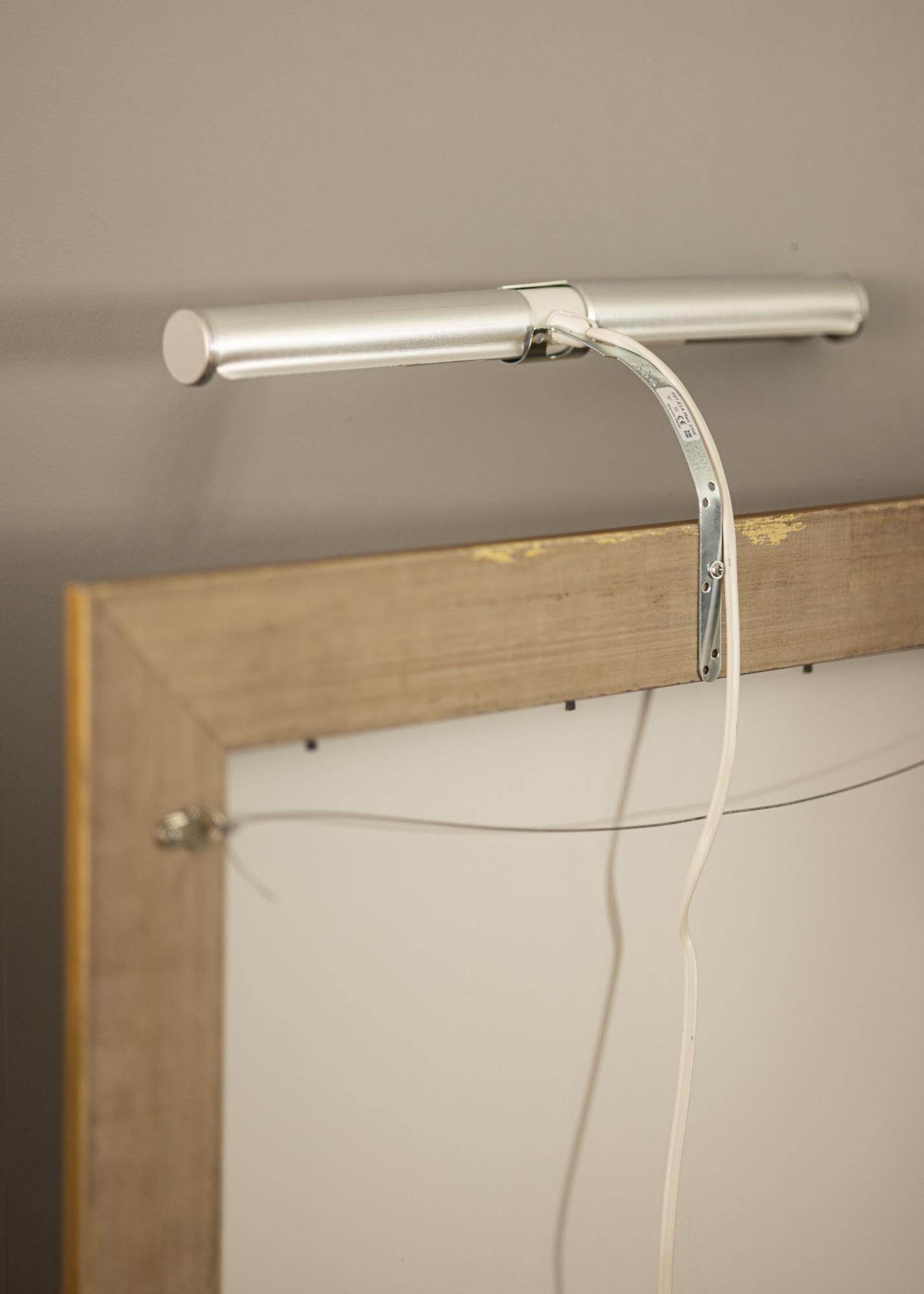 Normalerweise wird die Bildbeleuchtung an der Rückseite des Bilderrahmens befestigt. Der Nachteil besteht darin, dass dies nur bei Holzrahmen (und gewissen Kunststoffrahmen) funktioniert, die ein breites Profil aufweisen, um das Einschrauben des Rahmens zu ermöglichen. Mit unserer Wandhalterung musst du dir keine Gedanken darüber machen, sondern kannst die Bildbeleuchtung ganz einfach direkt an der Wand hinter deinem Bild befestigen.