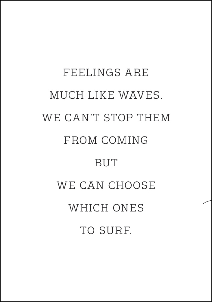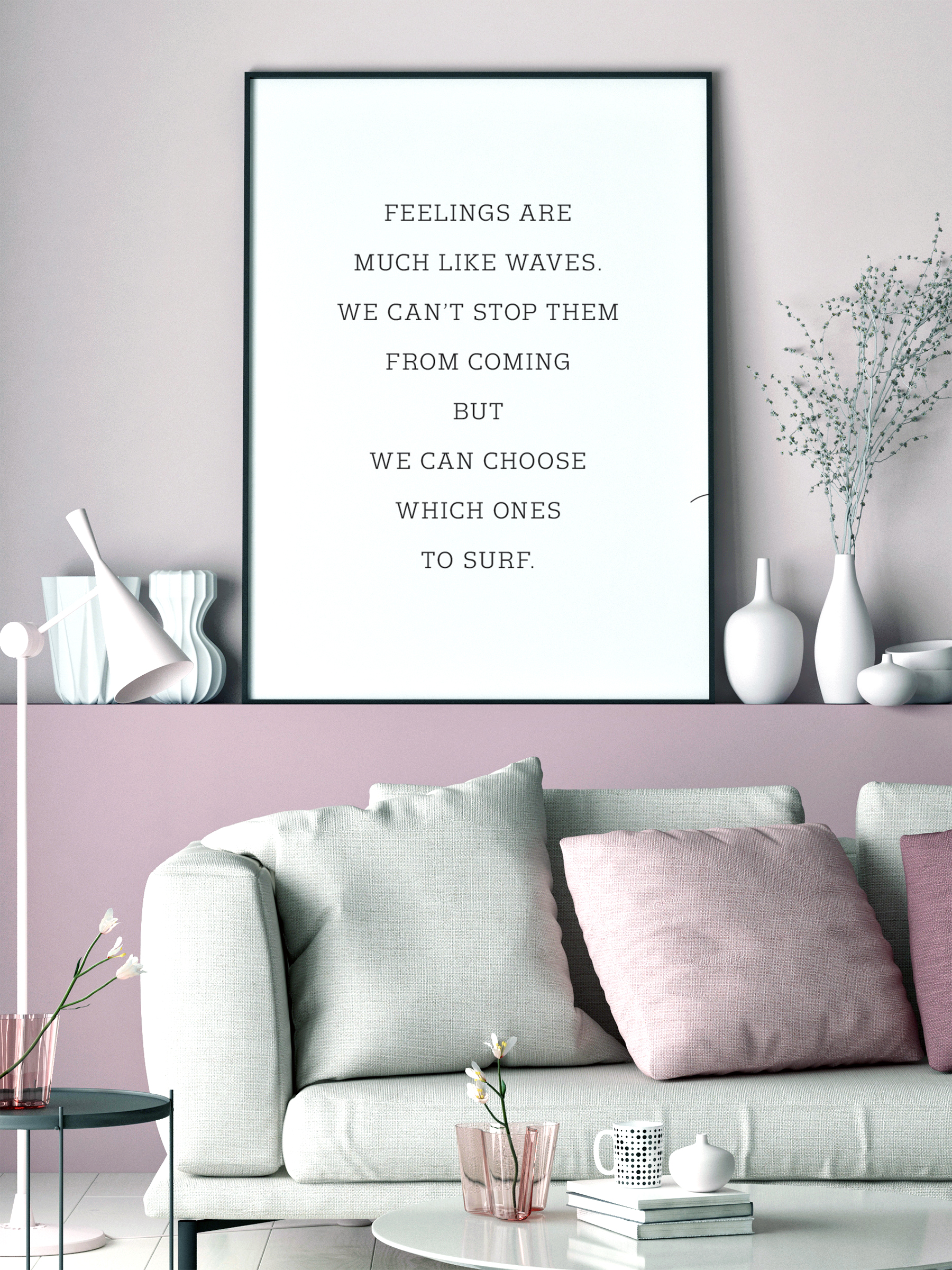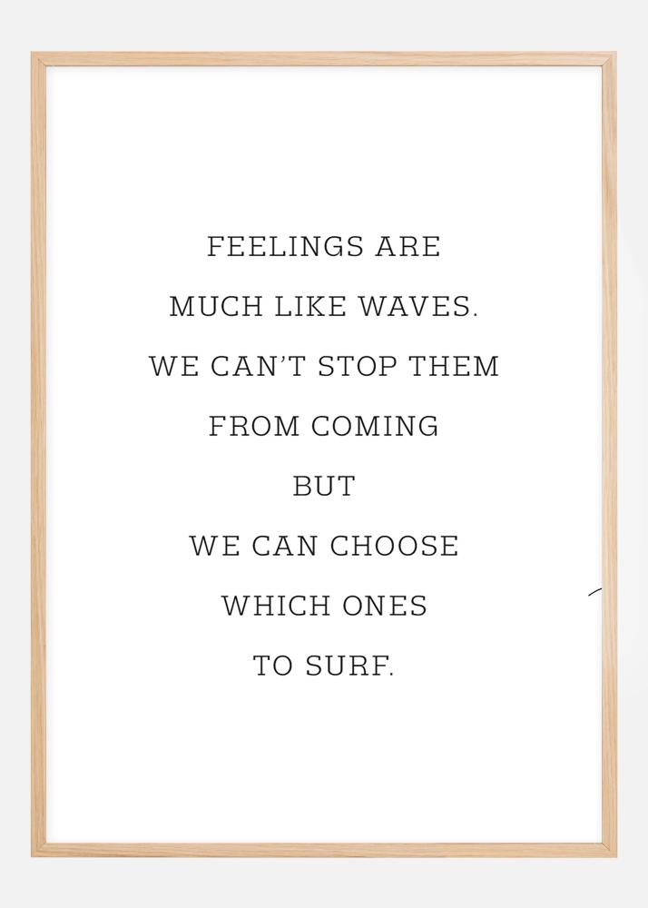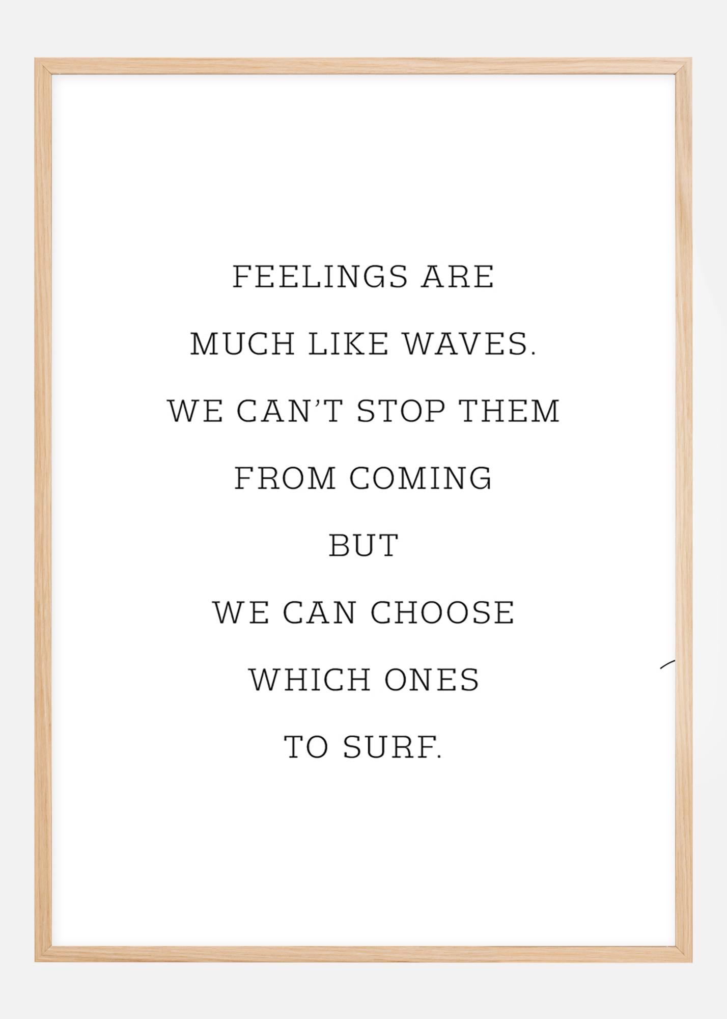 Ein Motivationsposter, das Sie jeden Tag aufs Neue motiviert. Gefühle sind wie Wellen. Wir können sie nicht aufhalten, aber wir können wählen, welche wir surfen wollen. Beginnen Sie Ihren Tag mit diesem starken Zitat in einer einfachen Schrift auf einem schlichten weißen Hintergrund.