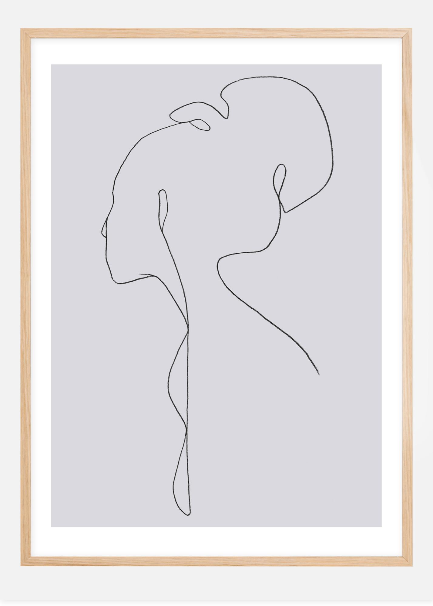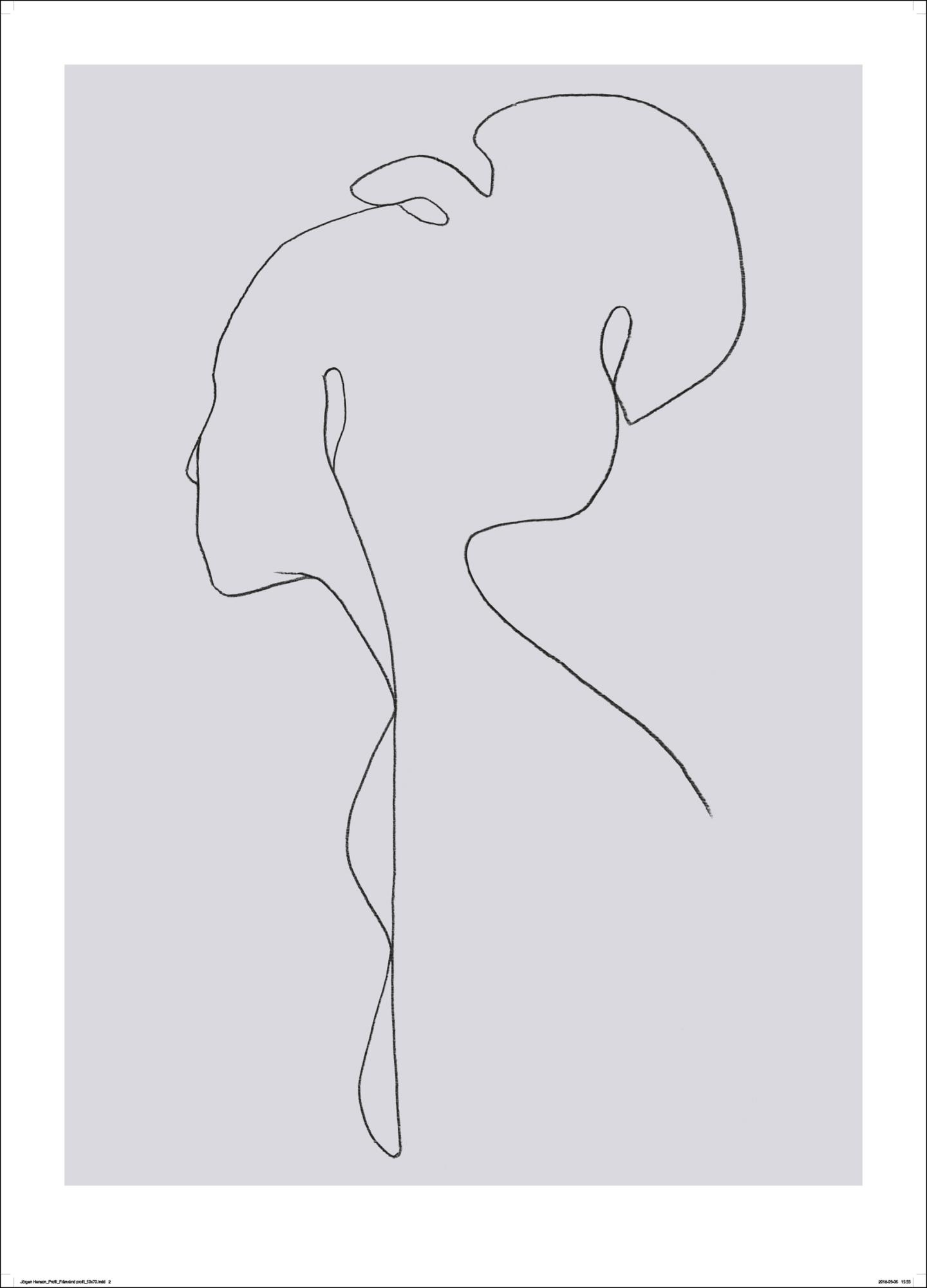 Mit spröden schwarzen Linien gegen einen grau getönten Hintergrund nimmt das Profil einer Frau Form an. Ihr Blick ist vom Betrachter abgewandt und ihr Haar ist zu einem Knoten auf dem Kopf gebunden. Ein schönes und stilvolles Poster, geschaffen von Jörgen Hansson Art.