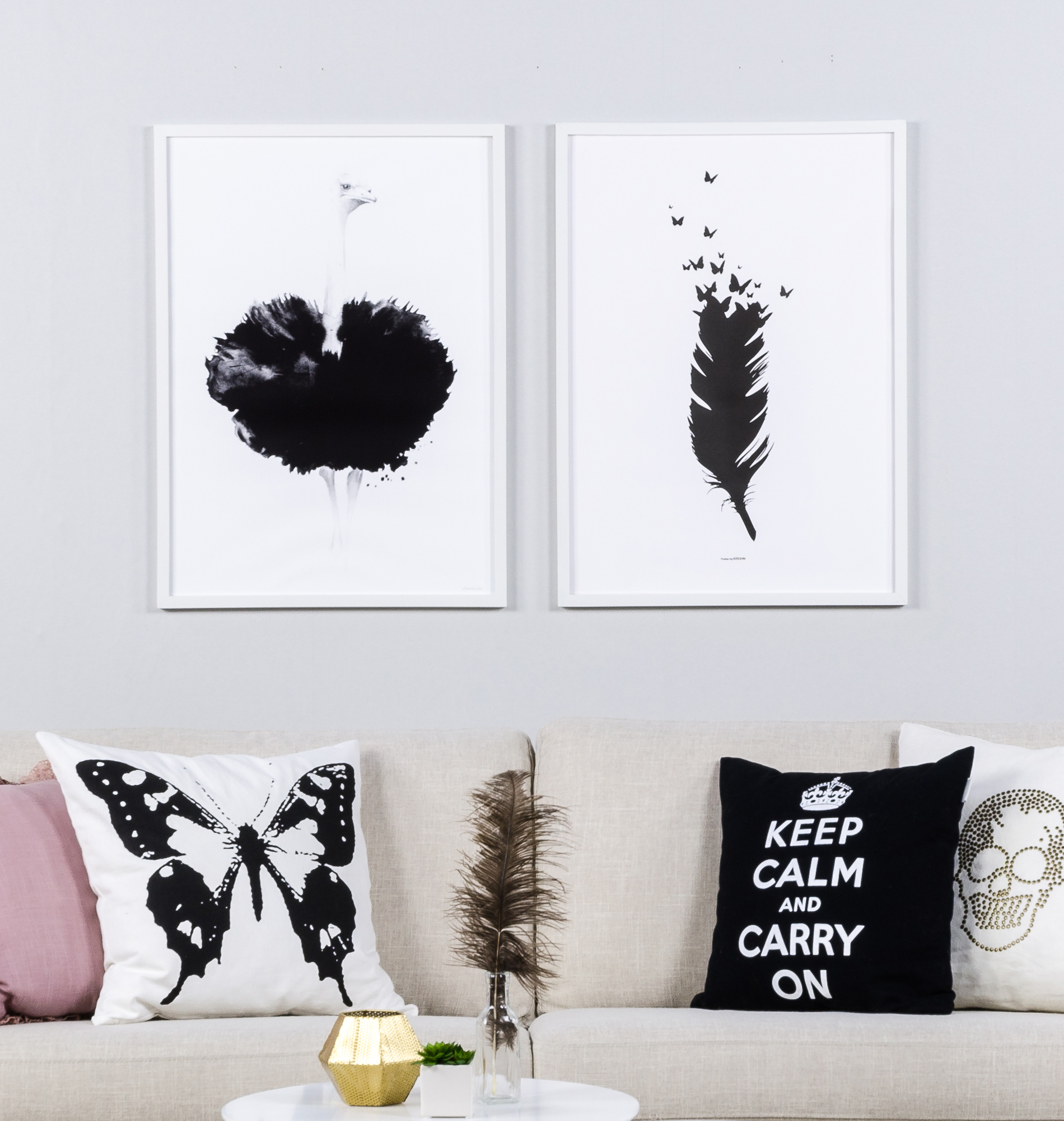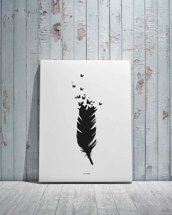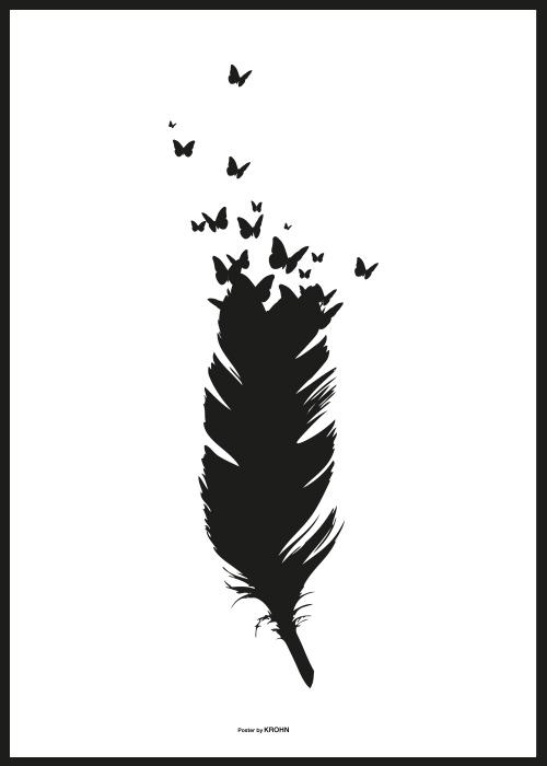 Dieses Poster zeigt eine stilisierte, schwarze Feder. An deren Spitze enstehen Schmetterlinge, die fröhlich davonflattern. Der schwarze Grafikdruck auf dem weißen Papier ergibt ein minimalistisches und doch romantisches Motiv, das zu allen Einrichtungsstilen passt. Ergänzen Sie das Poster mit einem Bilderrahmen, der sich in die Einrichtung des Zimmers einfügt.