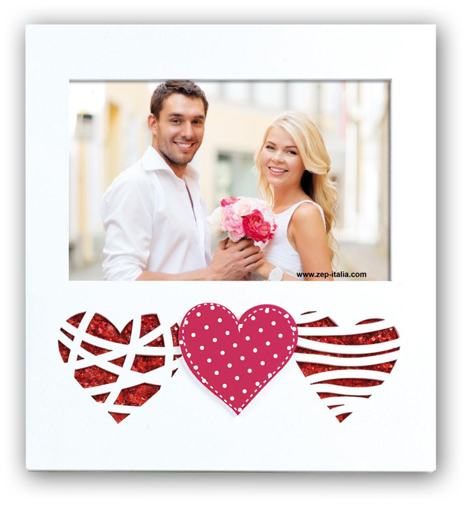 Eleganter Fotorahmen, auf dem sich alles um die Liebe dreht, mit drei niedlichen Herzen in verschiedenen Mustern, wobei sich das Herz in der Mitte vom restlichen Profil des Bilderrahmens abhebt. Perfekt für ein Bild von dir und deinem Schatz!