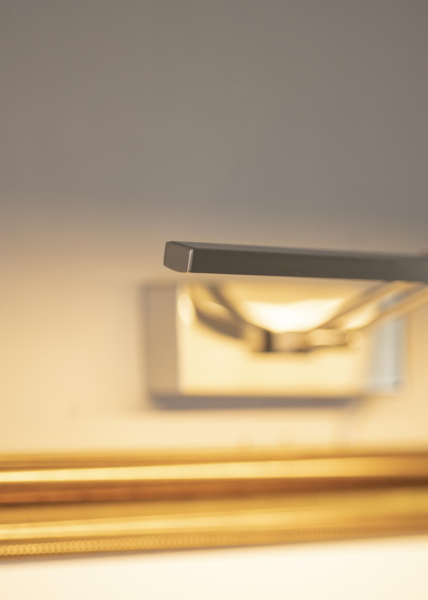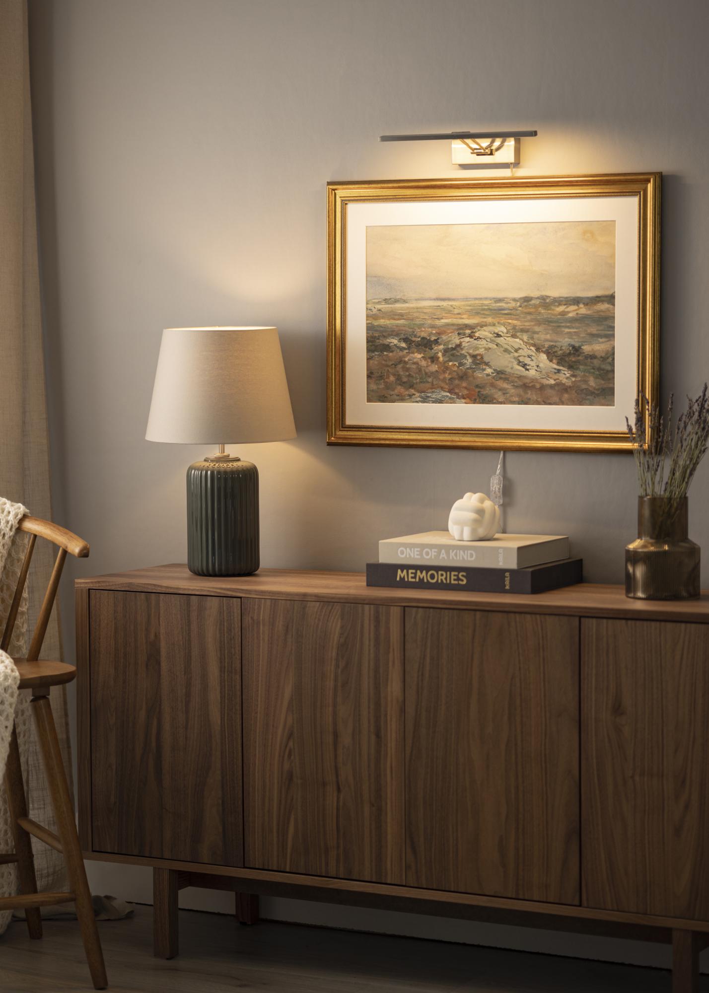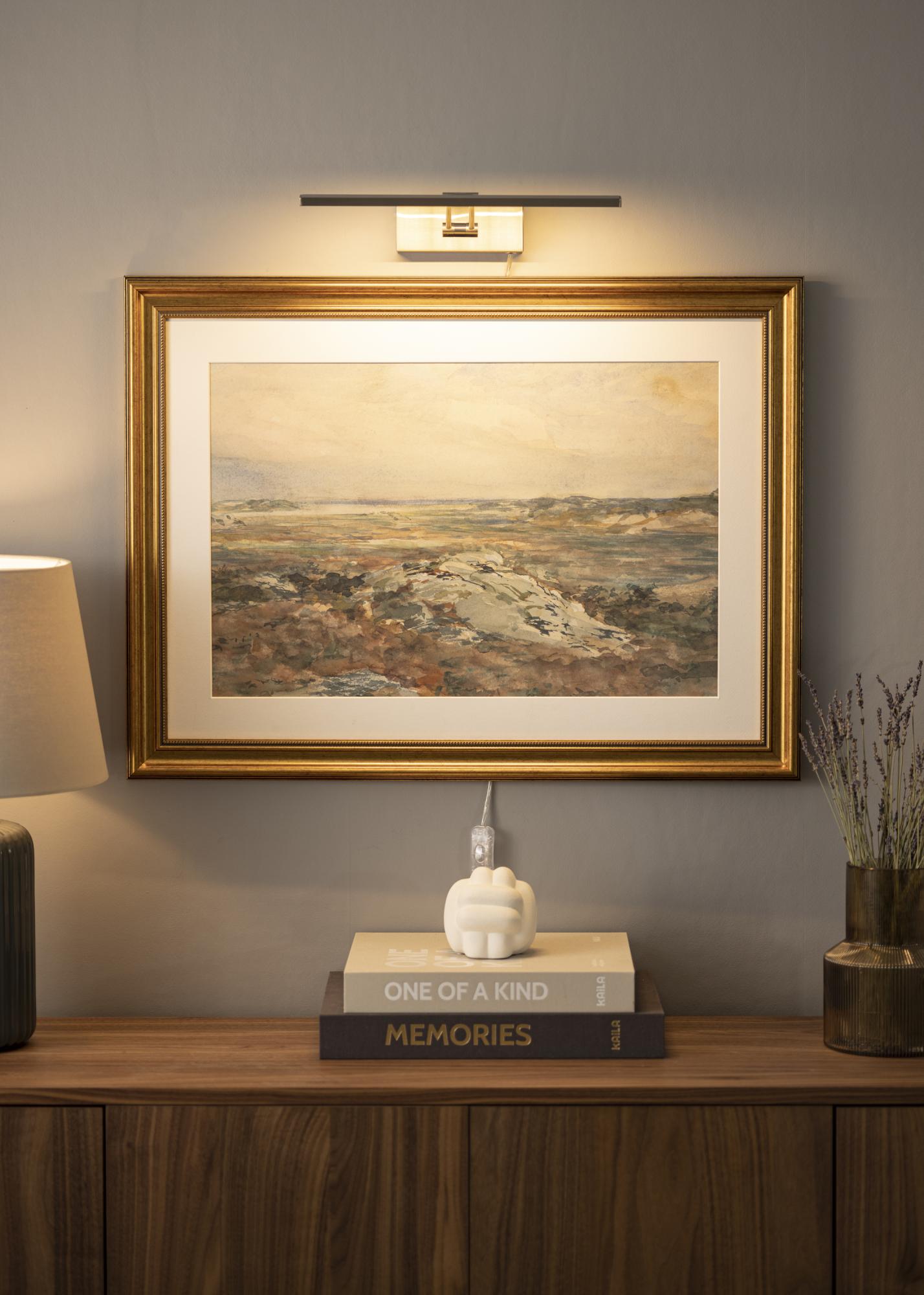 Bildbeleuchtung mn modernen schwedischen Design für Bilder mit einer Breite von 60-100 cm. Die Armatur ist 5 cm hoch und 37 cm lang, mit einem Abstand zur Wand von 20 cm. Mit den 720 Lumen starken LED-Leuchten wird ein angenehmes Licht erzeugt, auch für größere Bilder.