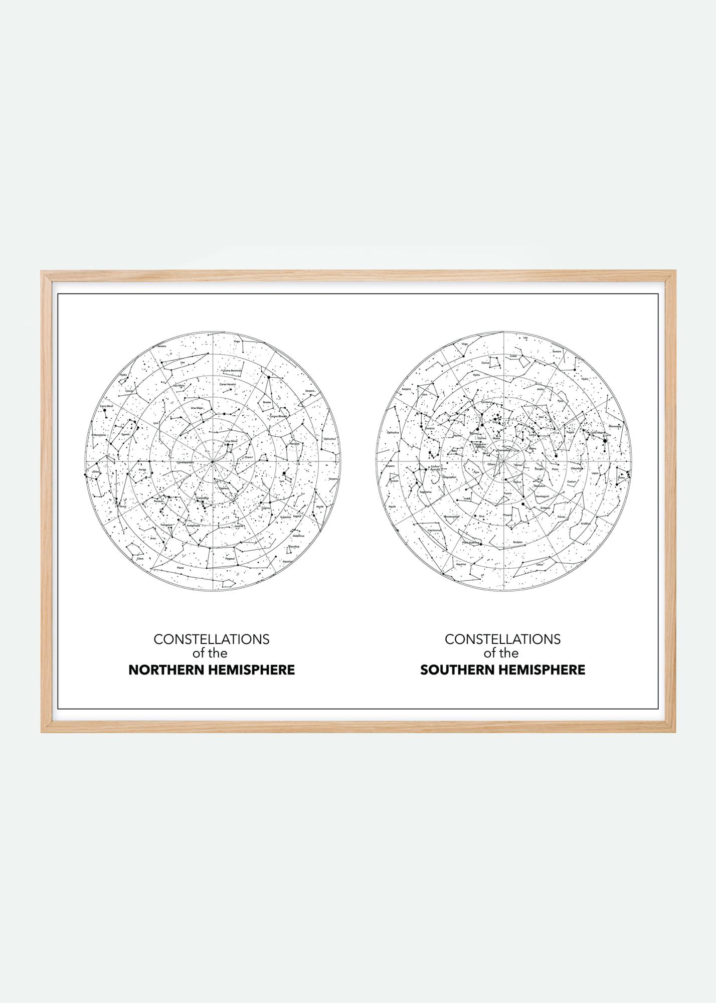 Ein Schwarz-Weiß-Druck der nördlichen und südlichen Hemisphäre. Auf weißem Hintergrund sind die Sternbilder in schwarzer Farbe schwach umrissen. Nebeneinander platziert, können Sie das Geheimnis der Sterne bewundern. Hängen Sie diesen Druck in Ihr Arbeitszimmer und schaffen Sie ein Gefühl der Unendlichkeit.