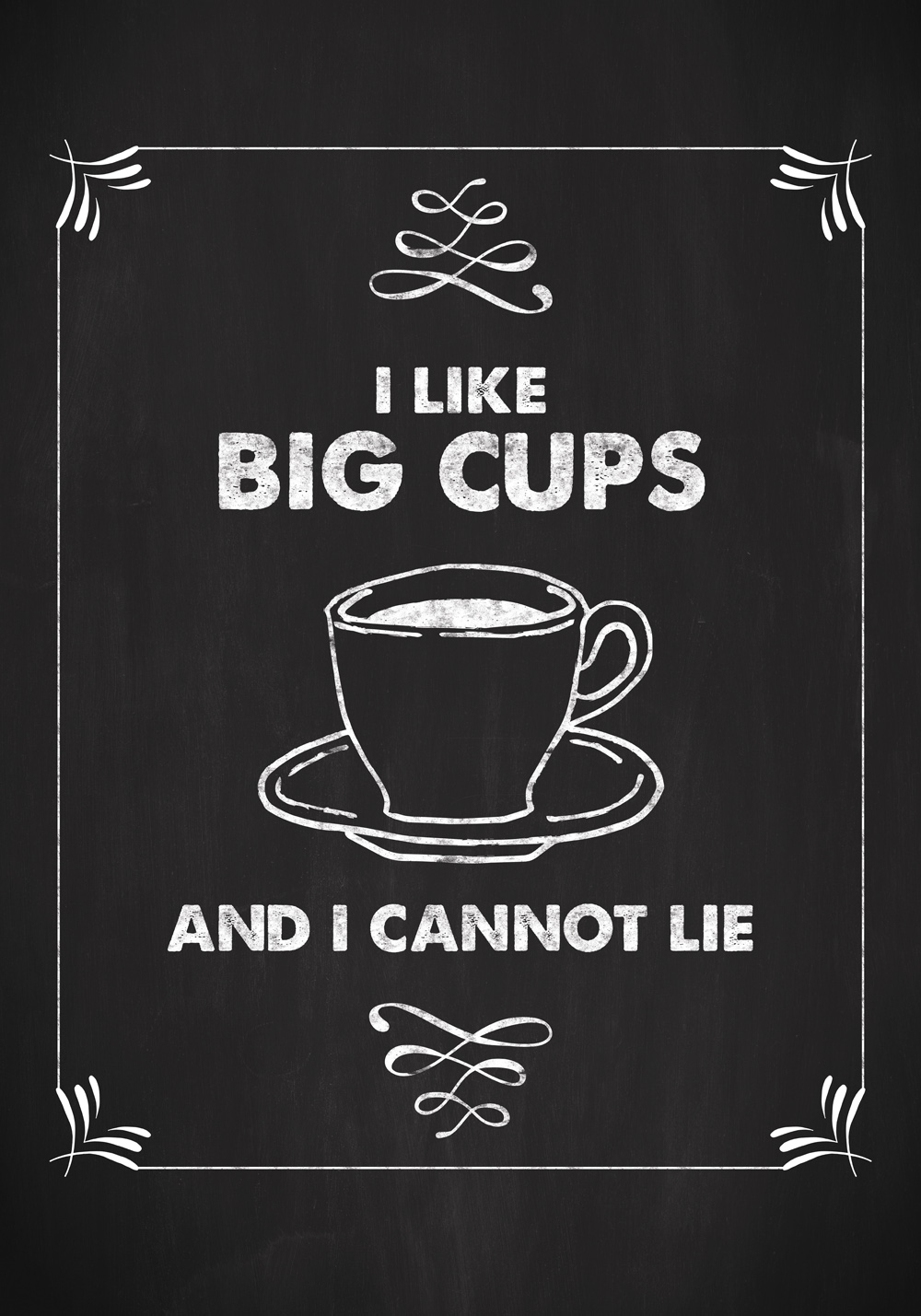 Pfiffiger print mit der Botschaft - I like big cups, and I cannot lie, für diejenigen, die große Tassen Kaffee oder Tee mögen. Das schwarz-weiße poster, mit dem Gefühl einer Schiefertafel, passt gut auf ein Bilderregal in der Küche zusammen mit Kochbüchern und Kochaccessoires. Oder warum nicht zusammen mit anderen grafischen print an einer Bildwand mit einem Thema aus der Welt der Küche aufhängen. Ergänzen Sie das poster mit einem einfachen schwarzen Rahmen, der den Text sprechen lässt und den Eindruck einer Schultafel verstärkt.