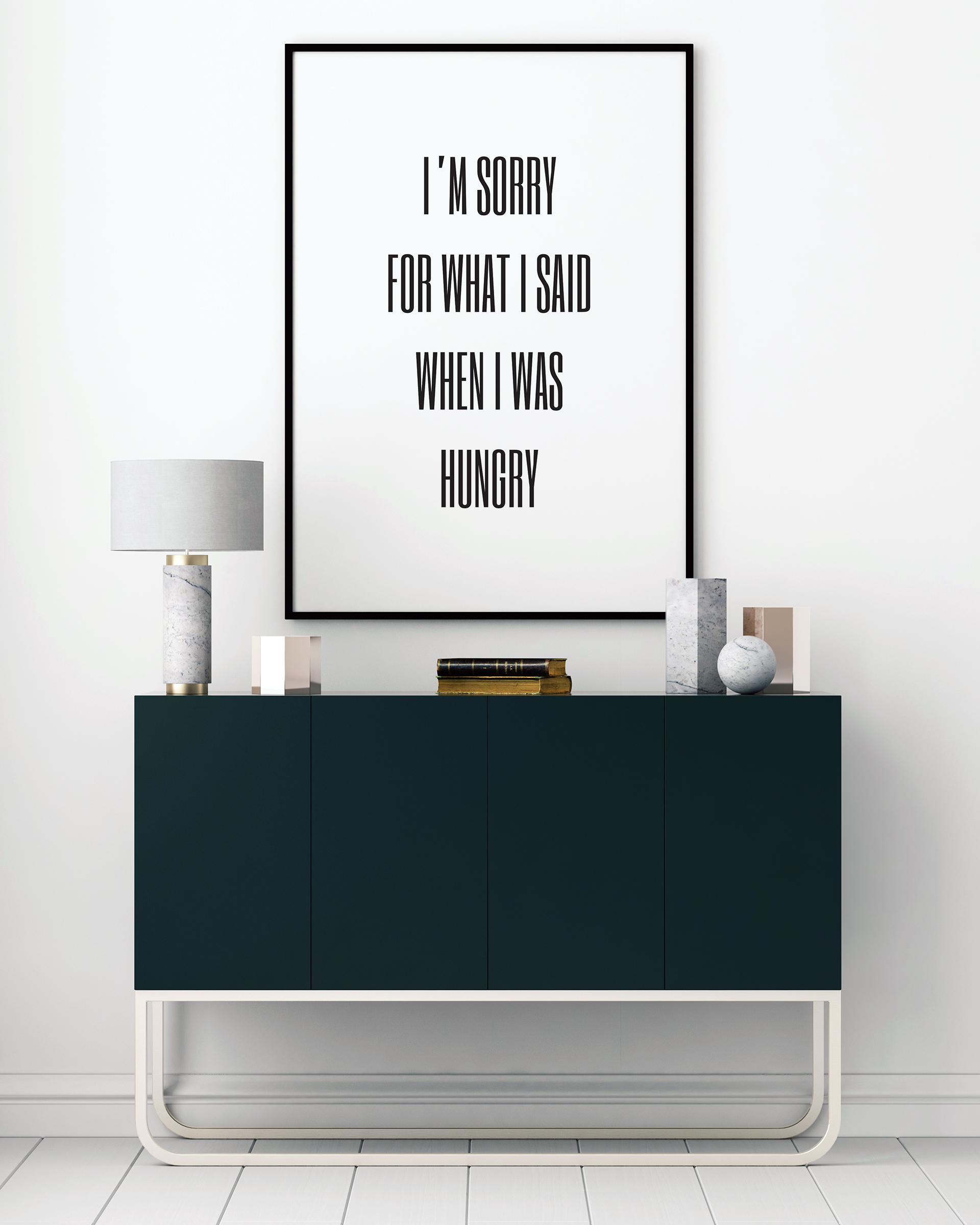 Ein einfaches und stilvolles Poster mit dem Text "I´m sorry for what I said when I was hungry" in großen Versalien. Ein Poster mit einer lustigen Botschaft, perfekt für die Küche als kleine Vorab-Entschuldigung, falls das Essen mal etwas später wird.