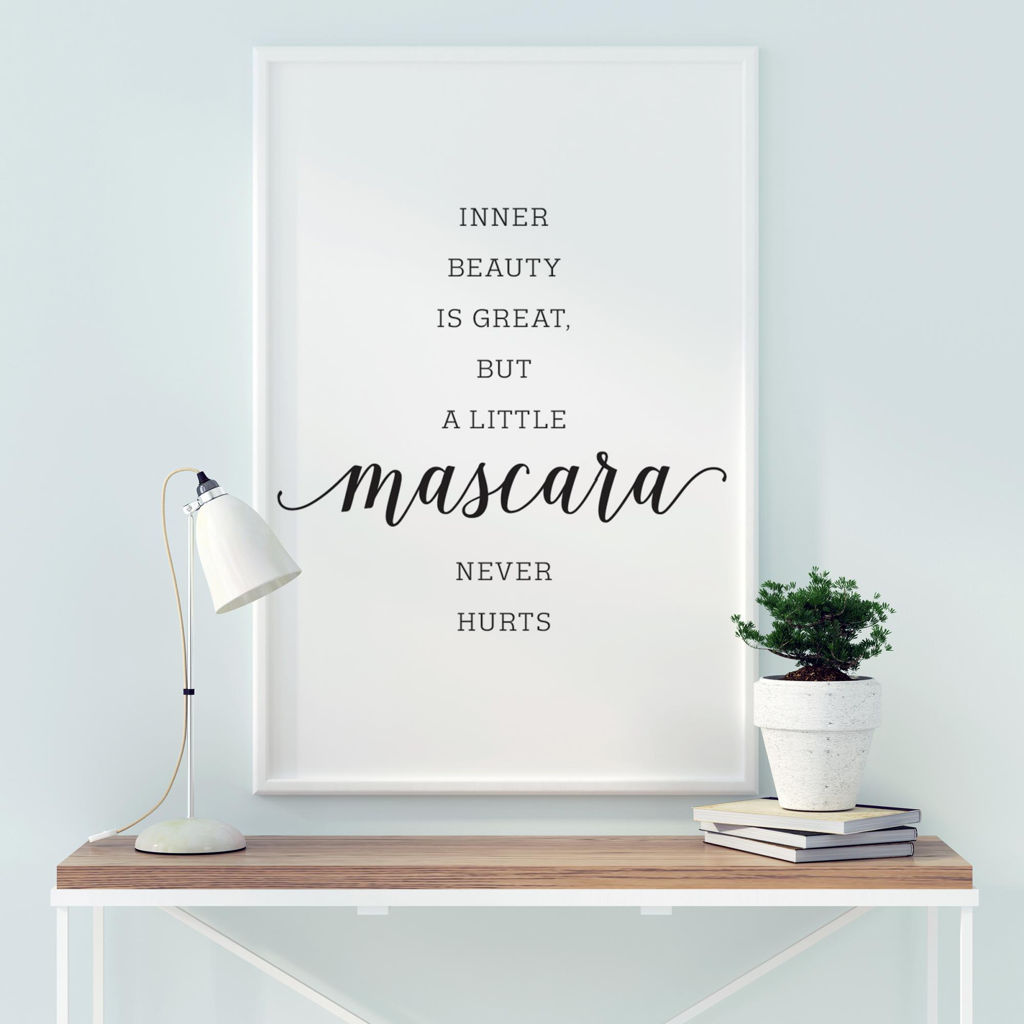 Ein wirkungsvoller Motivationsdruck, der eine Botschaft für alle vermittelt, die gerne gut aussehen. Innere Schönheit ist großartig, aber ein bisschen Wimperntusche schadet nie. Eine Botschaft, die man sich für den besonderen Look zu Herzen nehmen sollte. Ein schöner Druck zum Aufhängen neben Ihrem Schminktisch.