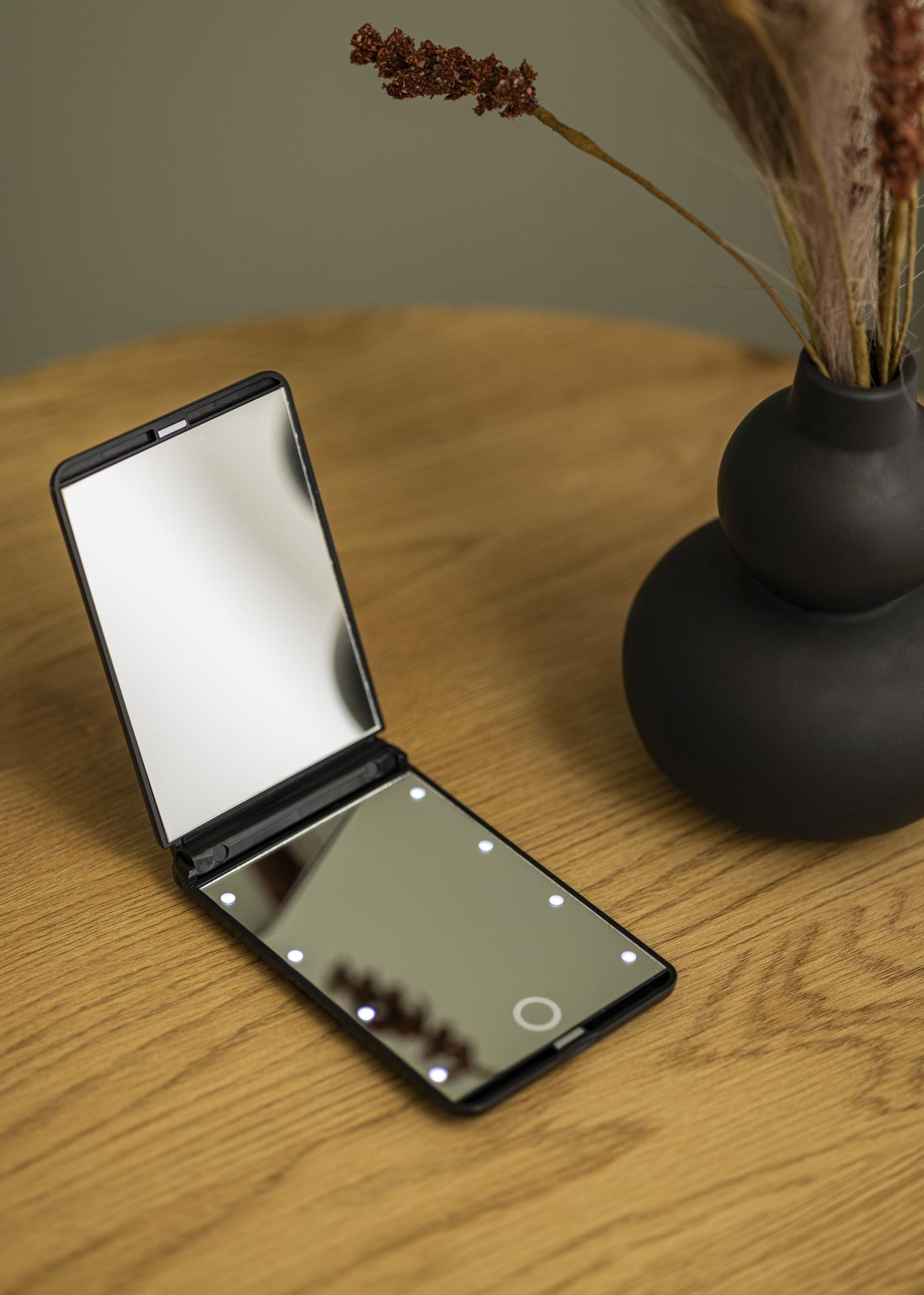 Schöner, klappbarer Kosmetikspiegel für unterwegs oder für die Reise in schwarzem, eleganten Design. Praktischer Taschenspiegel, der immer schnell zur Hand ist, egal wo man sich befindet. Der Taschen-Schminkspiegel verfügt über eine integrierter Beleuchtung rund um das kristallklare Spiegelglas in Form von 8 starken LEDs. Der obere Teil des Spiegel bietet eine 2x Vergößerung. Die LED-Beleuchtung ist dimmbar und leuchtet in einem warmweißen Licht von 3000K. Die gewünschte Lichtstärke kann einfach durch Drücken der Touch-Taste eingestellt werden.