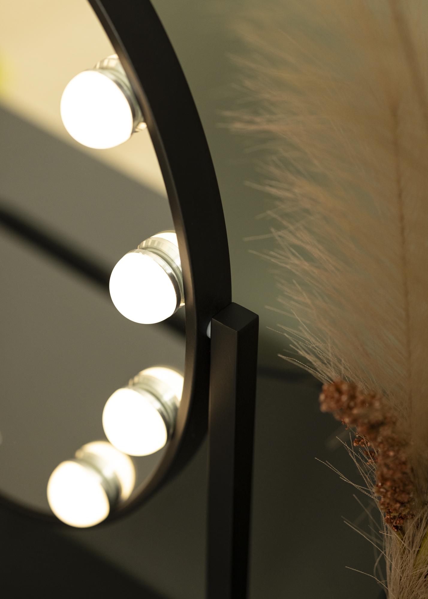 Eleganter, ovaler Schminkspiegel der schwedischen Marke KAILA. Schminkspiegel in trendy schwarzem Farbton mit integrierter, dimmbarer LED-Beleuchtung. Die LED-Beleuchtung in Form von 10 LEDs zeichnet sich durch das gleichmäßige, warmweiße Licht von 3000K aus. Die LED-Beleuchtung wird einfach durch Drücken des Touch-Sensors eingeschaltet. Die Lichtstärke kann durch Gedrückthalten der Taste für einige Sekunden lang eingestellt werden. Der Kosmetikspiegel misst 34x47 cm und kann 360° vertikal gedreht werden, sodass man sich auch aus verschiedenen Positionen bestens betrachten kann. Das zeitlose, glamouröse Design versprüht einen Hauch von Hollywood im Raum!