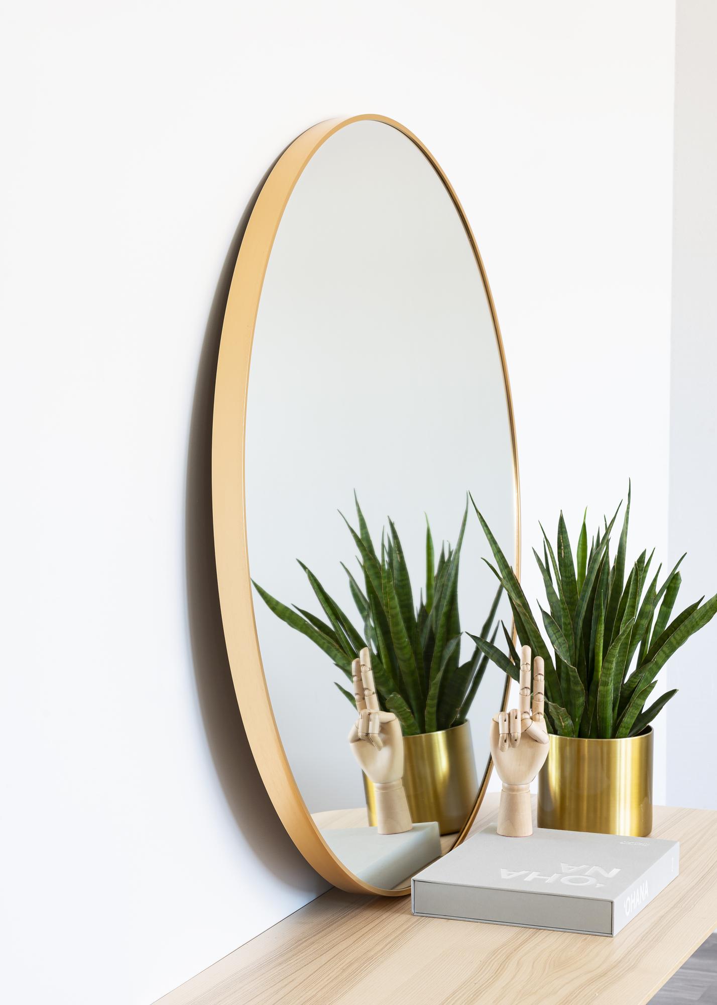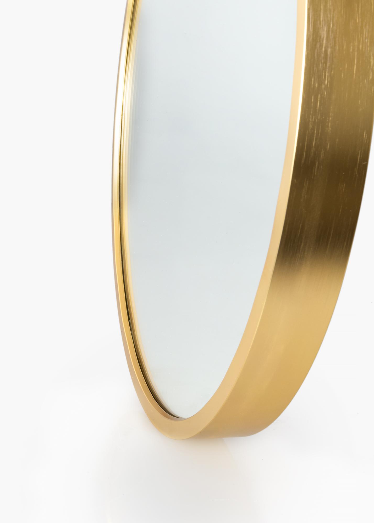 Ein runder Spiegel in stilvollem schwedischen Design mit einem Metallrahmen mit wunderschönem Gold-Finish. Die gebürstete Oberfläche des Rahmens lässt die schöne Goldfarbe etwas matter aussehen. Der Rahmen ist dünn und liegt damit voll im Trend, hat aber gleichzeitig - je nach Größe - eine Tiefe zwischen 30 und 40 mm, was bedeutet, dass er etwas aus der Wand herausragt und einen coolen 3D-Effekt erzeugt. Durch die Tiefe des Rahmens wirkt der Spiegel robust und behält gleichzeitig sein minimalistisches Erscheinungsbild bei.