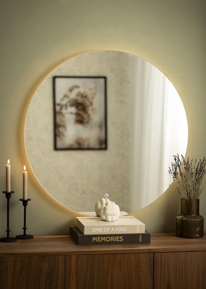 Klassischer Badezimmerspiegel rund in schwedischem Design von KAILA. Dieser Badspiegel ist mit integrierter LED-Beleuchtung ausgestattet, die den Spiegel dekorativ von hinten beleuchtet und mit einem einen angenehm warmweißen Schein, Lichtfarbe 3000 K, nach vorne strahlt. Die LED-Beleuchtung ist dimmbar und kann einfach durch Gedrückthalten des Touch-Sensors für einige Sekunden lang eingestellt werden. Die LED-Technologie ist eine energieschonendere Lichtquelle und steht für ein gleichmäßiges, natürliches Licht.