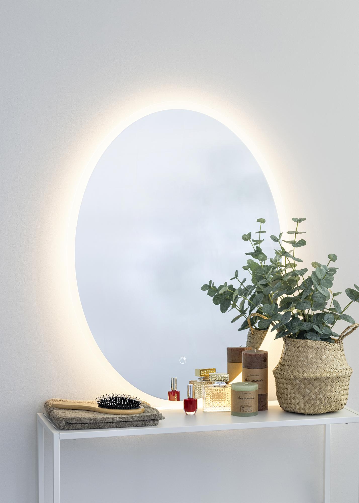 Ein wirklich toller ovaler Badezimmerspiegel in elegantem Design und mit integrierter LED-Beleuchtung! Die LED-Beleuchtung ist dimmbar und kann einfach durch Gedrückthalten des wasserdichten Touch-Feldes eingestellt werden. Der angenehm warmweiße Lichtschein von 3000 K beleuchtet den Spiegel mit einem nach vorne hin strahlenden Lichtschein. Die LED-Technologie ist eine energieschonendere Lichtquelle und steht für ein gleichmäßiges, natürliches Licht. Dieser Spiegel ist feuchtraumgeeignet und damit optimal für die Verwendung in Badezimmern. Der Spiegel ist für feste Installation vorgesehen und muss an einen Stromschalter angeschlossen werden. Damit der Spiegel ordnungsgemäß und korrekt funktioniert, muss er an einen normalen Schalter angeschlossen werden, nicht an einen Dimmschalter.