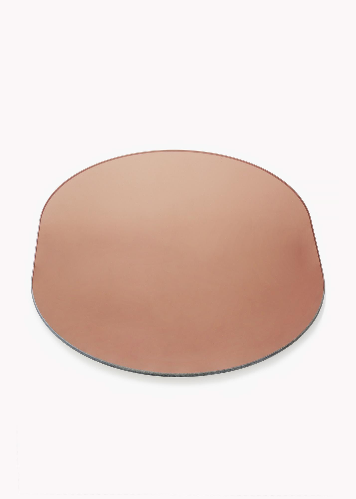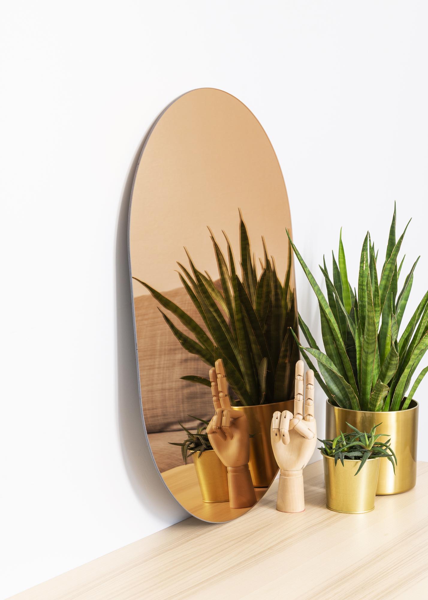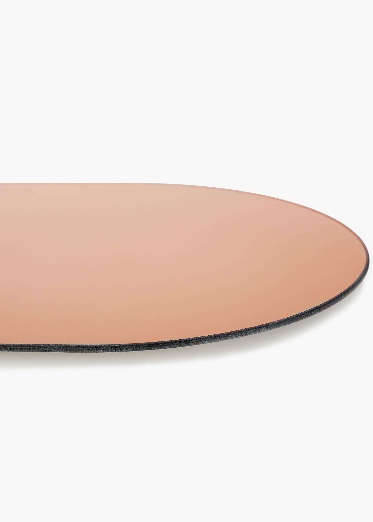 Dieser ovale Spiegel ist äußerst dünn und hat keinen Rahmen, was ihm ein modernes und elegantes Aussehen verleiht. Dieser trendige Eindruck wird durch das in stilvollem Roségold getönte Spiegelglas verstärkt. Dieses Detail macht den Spiegel besonders interessant und verleiht ihm zugleich sein elegantes Aussehen.