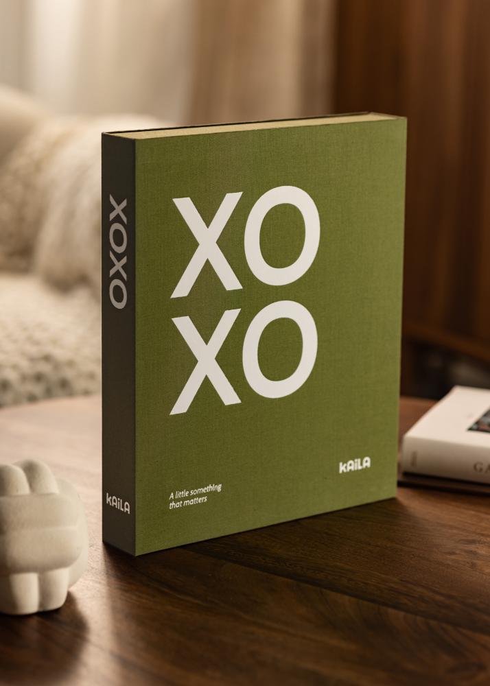 Hübsches, stilsicheres Fotoalbum, designt wie ein trendy Coffee Table Book, weshalb es auch Coffee Table Photo Album genannt wird. Das Fotoalbum zeichnet sich durch den eleganten Textil-Einband in Olivgrün und den weißen Aufdruck auf Vorder- und Rückseite mit dem wohlbekannten Abschiedsgruß ”XOXO”, der für Küsschen und Umarmungen steht, aus. Dieser trendige Titel wird durch den Untertitel mit den Worten ”A little something that matters” komplettiert, der sich ganz unten links in der Ecke befindet. Ein wirklich stilvolles Fotoalbum mit einem etwas anderen, verspielteren Design, das sich ganz bestimmt von der Masse abhebt.