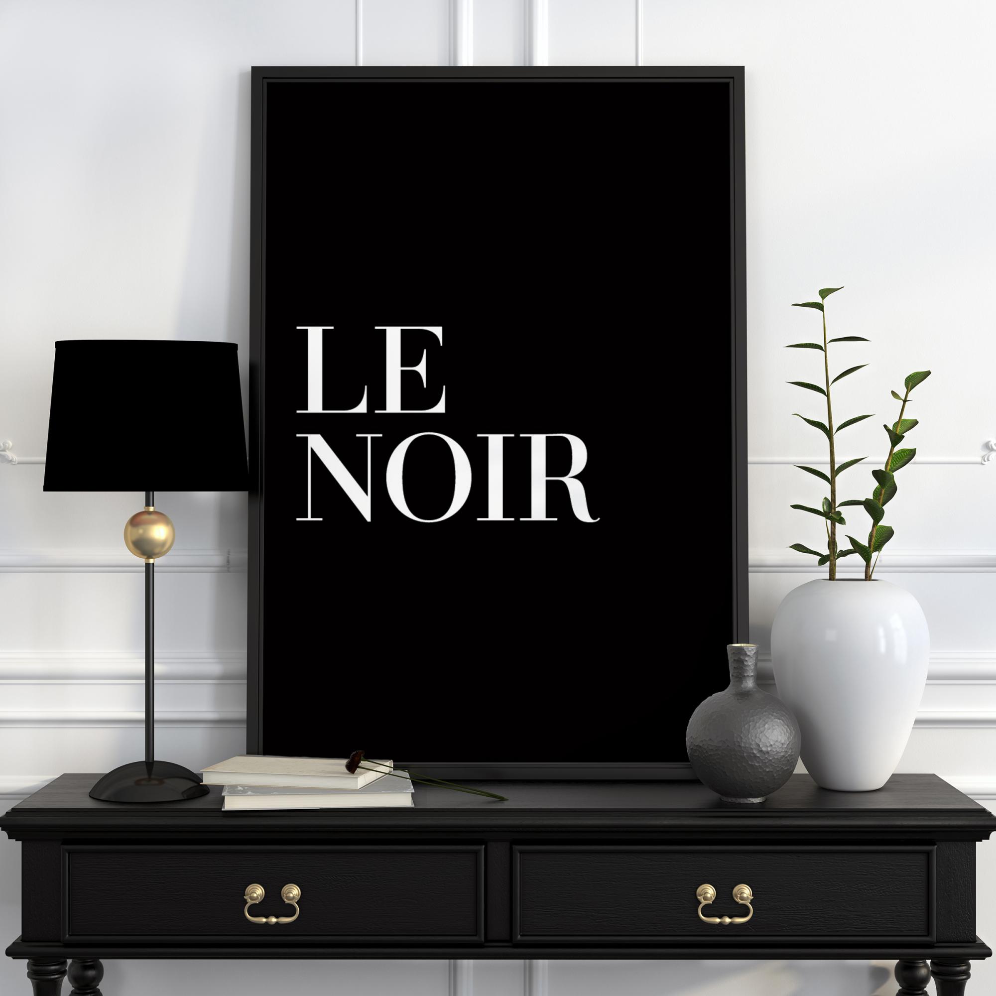 Ein einfaches und minimalistisches Textposter mit dem Text "Le Noir", Das Schwarze, in großen weißen Versalien auf einem schwarzen Hintergrund. Ein Poster, das perfekt an einer größeren Bilderrahmenwand passt, vielleicht in Kombination mit dem Poster "Le Blanc", Das Weiße? Ergänzen Sie gerne mit etwas aus unserem großen Sortiment an bilderrahmen.