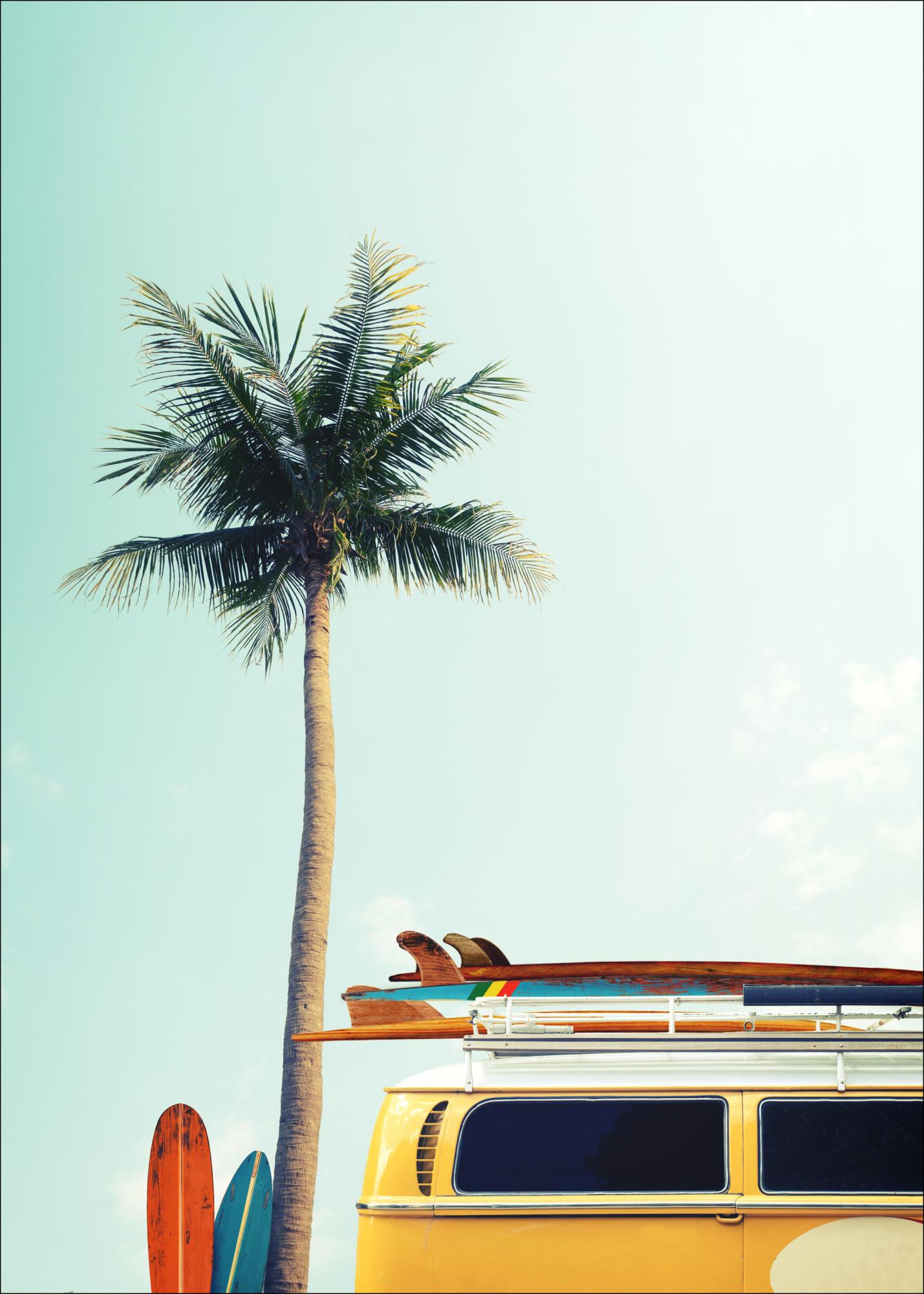 Ein fotografisches poster mit dem klassischen VW-Bus mit seinen Surfboards, geparkt unter einer Palme unter einem wolkenlosen Himmel. Ein farbenfrohes poster, das ein herrliches Gefühl von Sommer und Freiheit vermittelt. Kombinieren Sie es gerne mit anderen Favoriten zu einer größeren Bildwand.