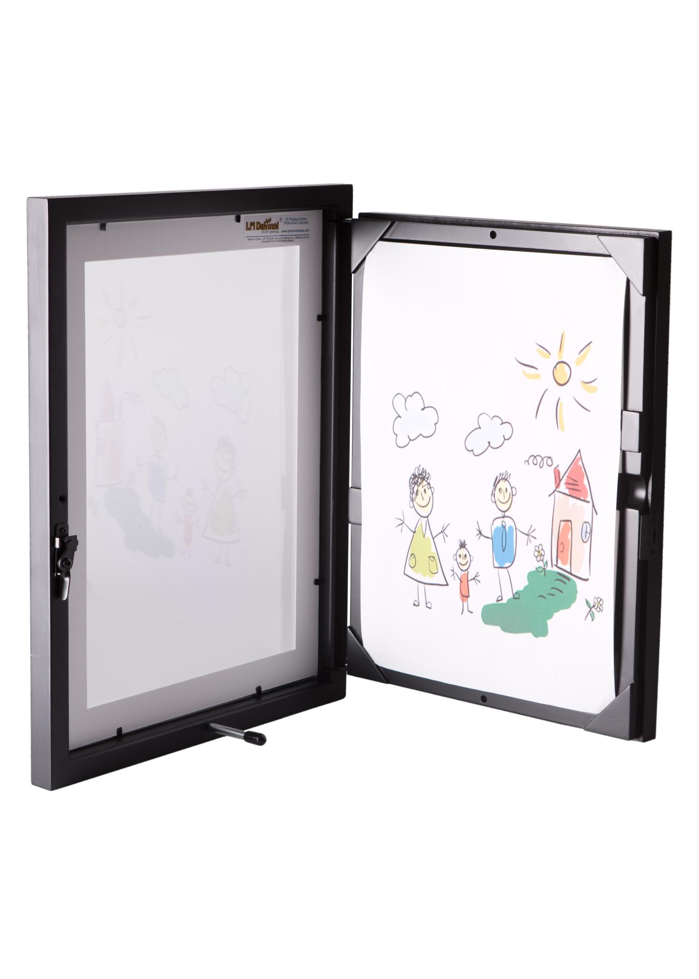 Einfacher und flexibler Zeichnungsrahmen im A4-Format. Perfekt für alle Kinderzeichnungen. Die Zeichnungen lassen sich leicht im Bilderrahmen ersetzen, sobald neue Kunstwerke geschaffen wurden. Der Bilderrahmen lässt sich einfach auf der Seite öffnen. Der Da Vinci Zeichnungsrahmen ist ein stilvoller schwarzer Bilderrahmen und passt überall in der Wohnung. Die Zeichnungen der Kinder werden damit sorgfältig und sicher aufbewahrt. Mach dein Kind stolz und hänge seine Bilder eingerahmt in seinem Zimmer auf. Ein perfektes Geschenk für einen Geburtstag oder Weihnachten, das von Klein und Groß geschätzt wird. Gib Zeichnungen, Fotos oder Diplomen einen praktischen, einfachen Bilderrahmen und mache sie zu einem Teil deiner Einrichtung.