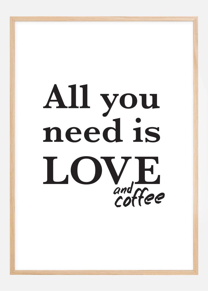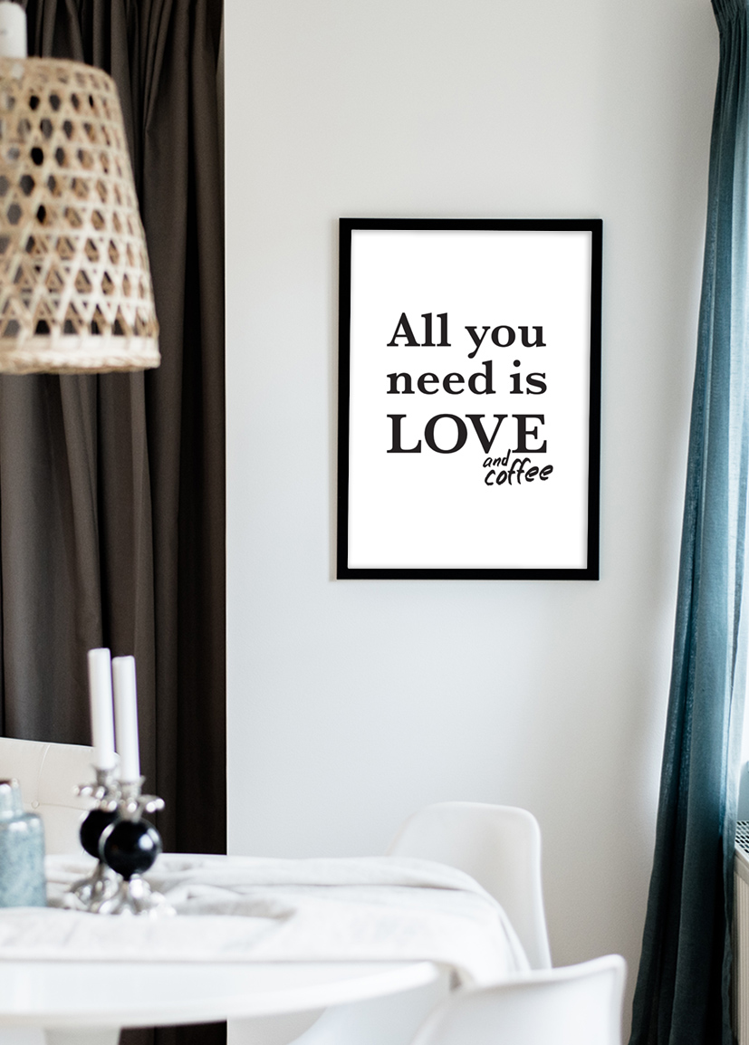 Alles, was du hier im Leben brauchst, ist Liebe. Und natürlich Kaffee! Dieses charmante Poster wird ein schönes Element in der Kücheninneneinrichtung zu Hause oder bei der Arbeit. Das Poster ist weiß mit einem schwarzen Druck in Form des Textes "All you need is love and coffee". Man bekommt den Eindruck, dass "and coffee" nachträglich hinzugefügt wurde. Das schwarz-weiße Design lässt sich vorteilhaft mit einem stilvollen bilderrahmen in deiner Lieblingsfarbe kombinieren.