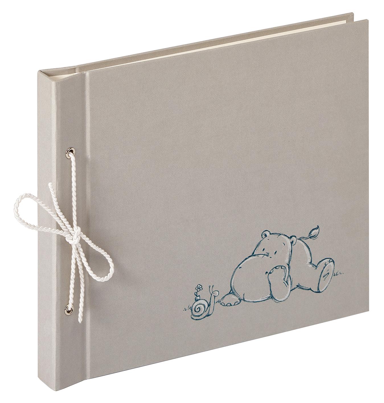 Eine süße kleine Person verdient ein mindestens genauso süßes Fotoalbum! Dieses stilvolle Babyalbum ist mit grauem Textil bezogen und mit einer weißen Schleife verziert, die an silberfarbenen Ösen befestigt ist. Auf der Vorderseite befindet sich ein niedliches Motiv in Form eines kleinen Nilpferds, das mit dem Schwanz wedelt, und einer Schnecke mit einer Blume auf ihrem Haus. Das Album enthält 50 cremeweiße Seiten, auf denen du deine Bilder selbst einfügen kannst. Auf jeder Seite ist das gleiche entzückende Nilpferd abgebildet und dir stehen 4 Zeilen für persönliche Notizen zur Verfügung.