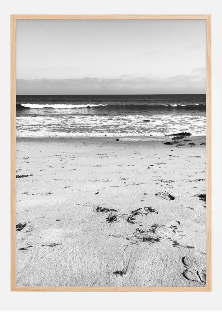 Ein Naturfoto in Schwarzweiß, auf dem schäumende Wellen an einen stillen Strand spülen. Einige leichte Fußspuren im Sand sind das einzige Zeichen menschlicher Anwesenheit. Ein ruhiges und harmonisches Poster, erstellt von Fotograf Saphira Consilio.