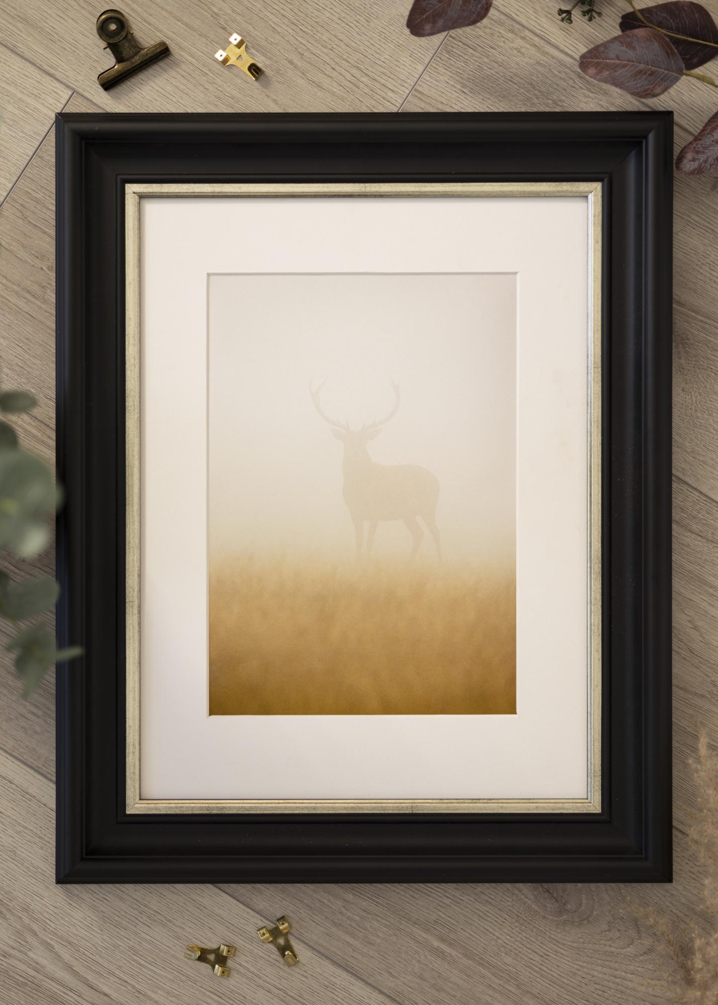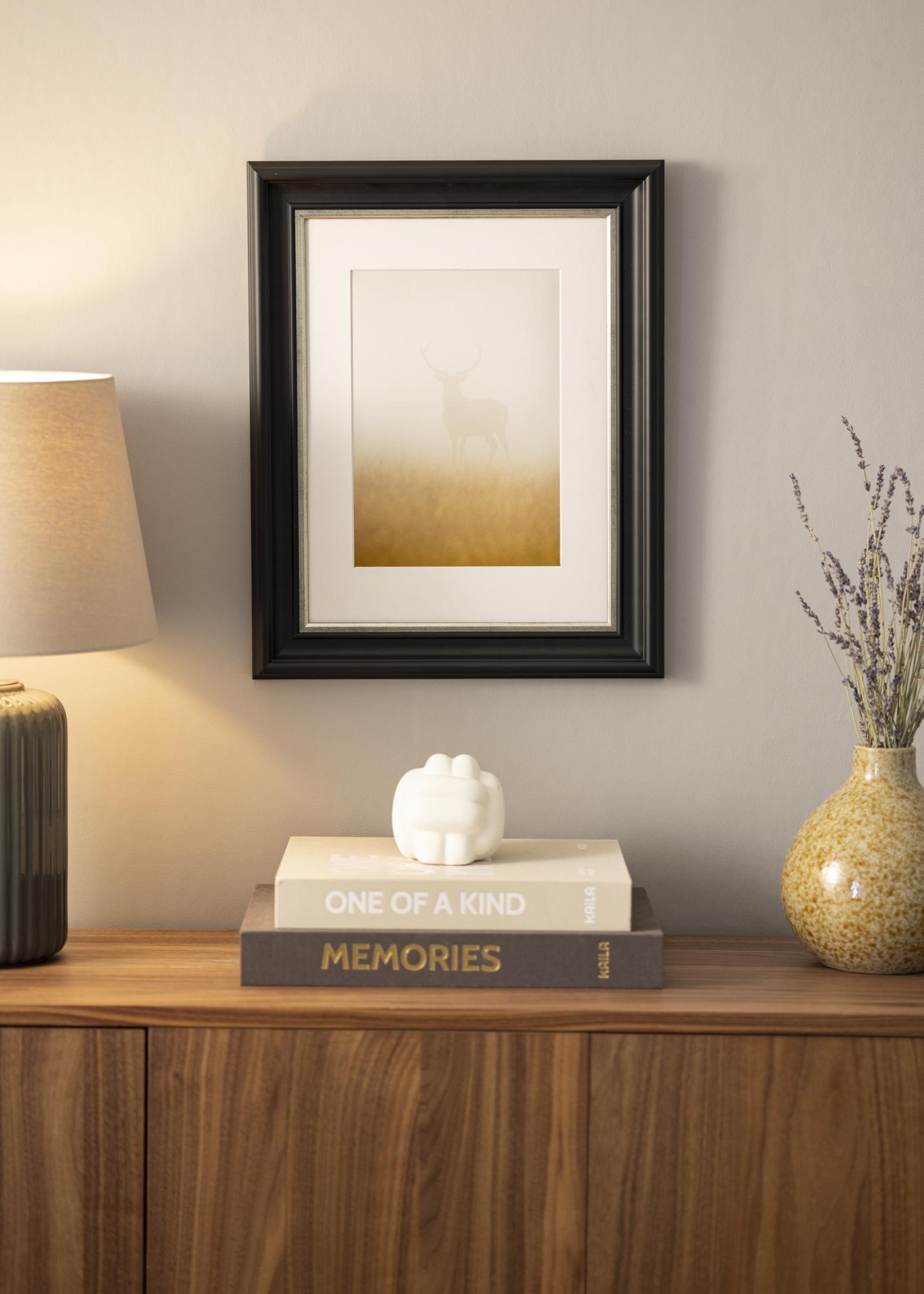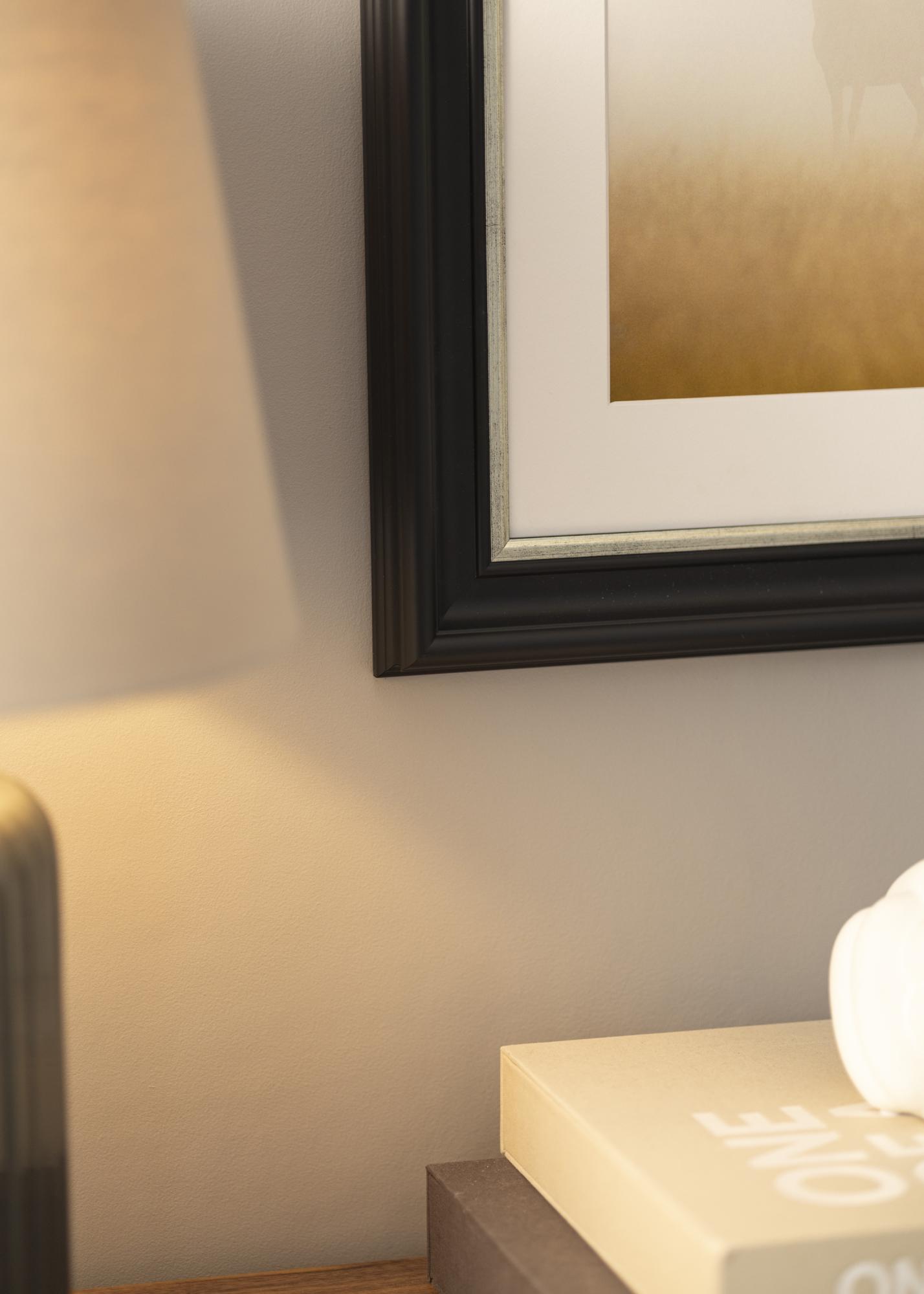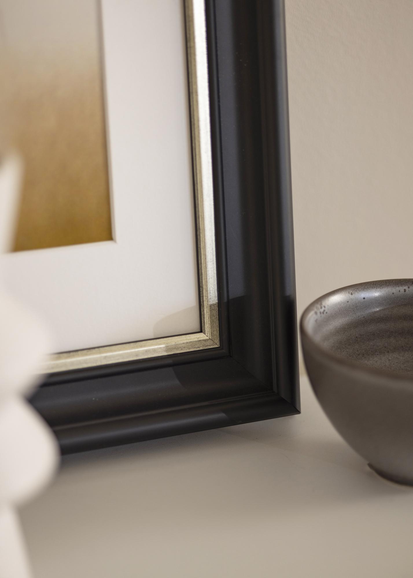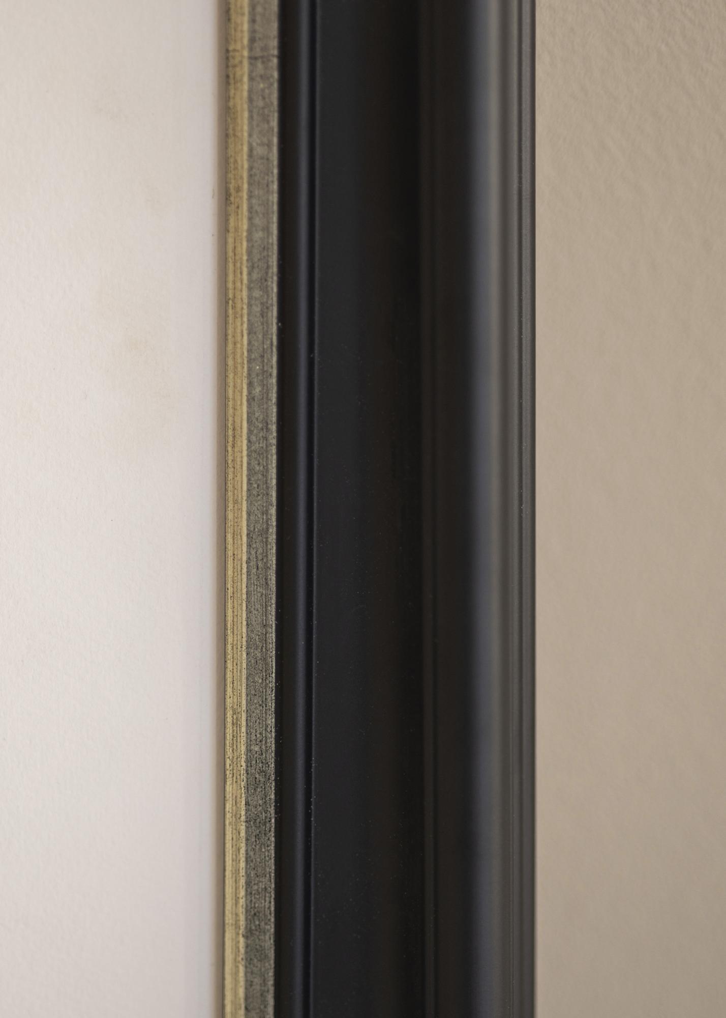 Mora Premium Schwarz-Silber ist einer unserer schönsten Rahmen. Hergestellt aus Holz aus unseren schönen schwedischen Wäldern und in unserer eigenen Rahmenwerkstatt zusammengebaut. Dadurch können wir dir eine Qualität versprechen, die den normalen Standard übertrifft. Der Bilderrahmen hat ein stilvolles breites schwarzes Profil mit einer Breite von ganzen 57 mm und einer schmalen gebürsteten Silberkante, die direkt neben dem Motiv verläuft. Perfekt für deine schönsten Fotos!