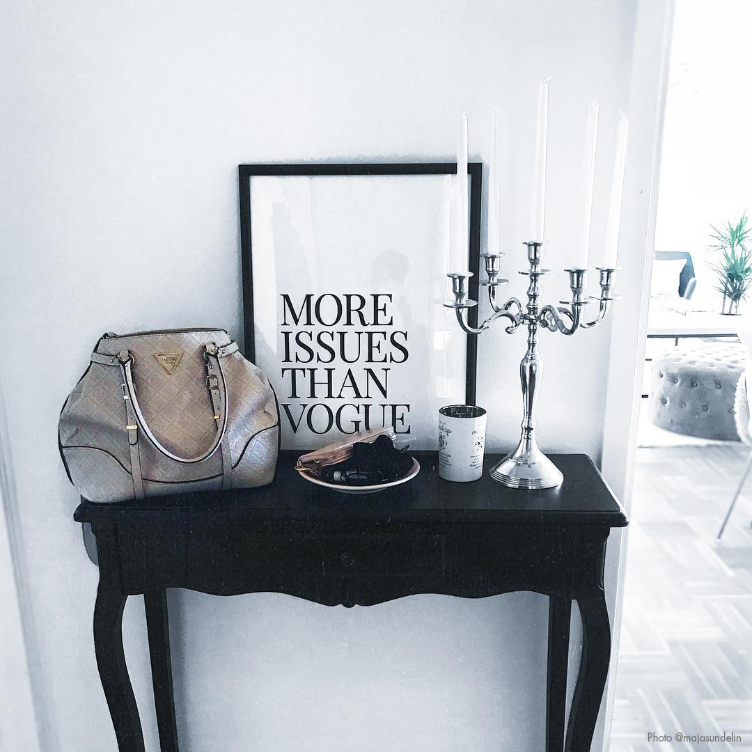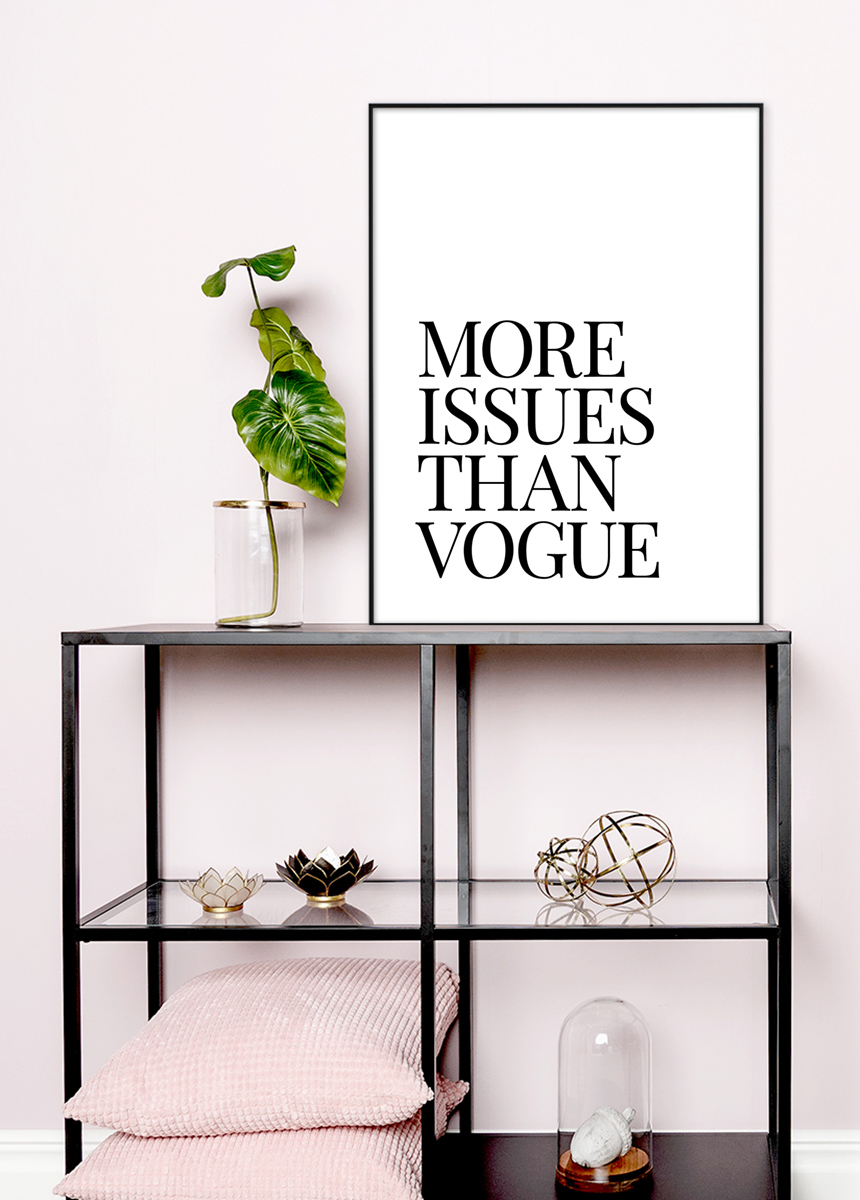 Sei selbstbewusst mit einem Augenzwinkern und hänge dieses stilvolle poster in deinem Zuhause oder am Arbeitsplatz auf. Das plakat ist weiß mit einem schwarzen Text, der sagt „More Issues Than Vogue“. Als eine zusätzliche schlaue Detail ist der Text in einer Schriftart geschrieben, die an die verwendet in dem berühmten Modezeitschriftslogo erinnert. Ergänze es mit einem goldfarbenen Rahmen für ein extra glamouröses Gefühl! Erhältlich in mehreren verschiedenen Größen, von denen eine garantiert für den Raum passt, in dem du es haben möchtest.