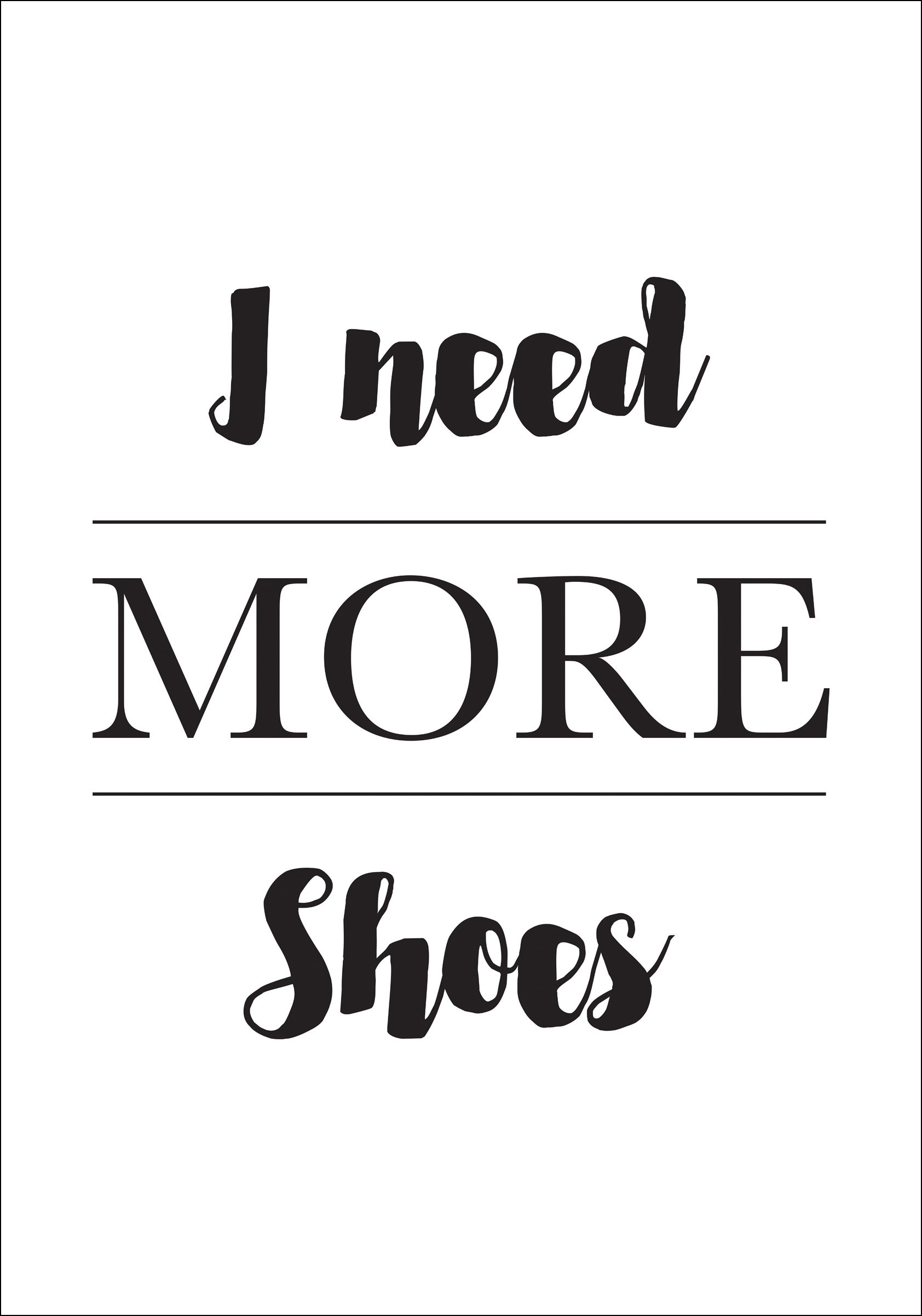 Bist du ein stolzer Shopaholic mit einem Fokus auf Schuhe, haben wir hier ein poster, das perfekt zu dir passt! Das charmante Motiv ist schwarz und besteht aus dem Text "I need more shoes", gedruckt in 2 verschiedenen Schriftarten. In der Mitte verlaufen zwei dekorative schwarze Linien. Das elegante und schlichte Design passt hervorragend zu einem schwarzen oder weißen Rahmen. Wenn du es noch persönlicher gestalten möchtest, wählst du einen Rahmen in deiner Lieblingsfarbe. Das poster ist in mehreren verschiedenen Größen erhältlich, so dass du leicht eine finden kannst, die genau zu deinem Schreibtisch oder deiner Wand passt.