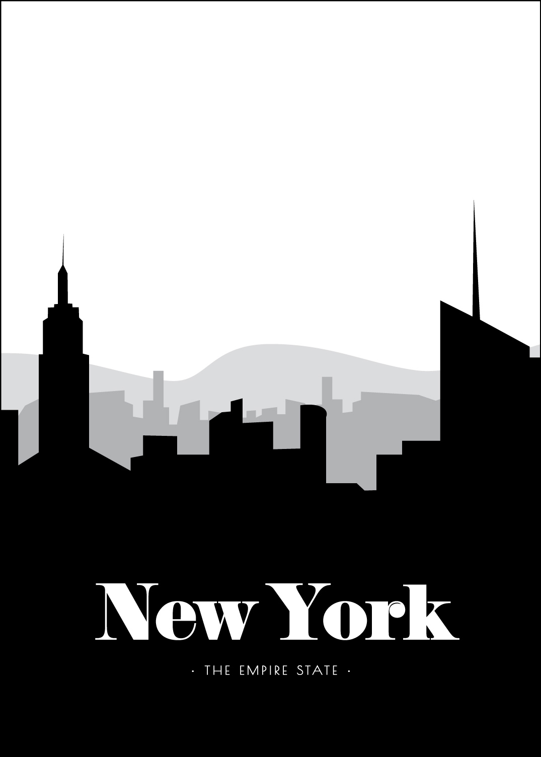 Die lebendigste, lauteste und aufregendste Stadt der Welt muss New York sein! Feiern Sie diese wunderbare Metropole mit diesem grafischen Plakat und lassen Sie es zu einem stilvollen Bestandteil Ihres Interieurs werden. Das Poster stellt Silhouetten in 3 verschiedenen Schichten dar, wobei die hintere grau und die 2 vorderen dunkler grau bzw. schwarz sind. In der vorderen Silhouette können Sie unter anderem das Empire State Building und das Rockefeller Center erkennen. Gegen das Schwarze steht der Text „New York, The Empire State“ in weißem Druck. Die New York Skyline ist in 6 verschiedenen Formaten und Preisklassen erhältlich. Ergänzen Sie es gerne mit einem weißen Rahmen.