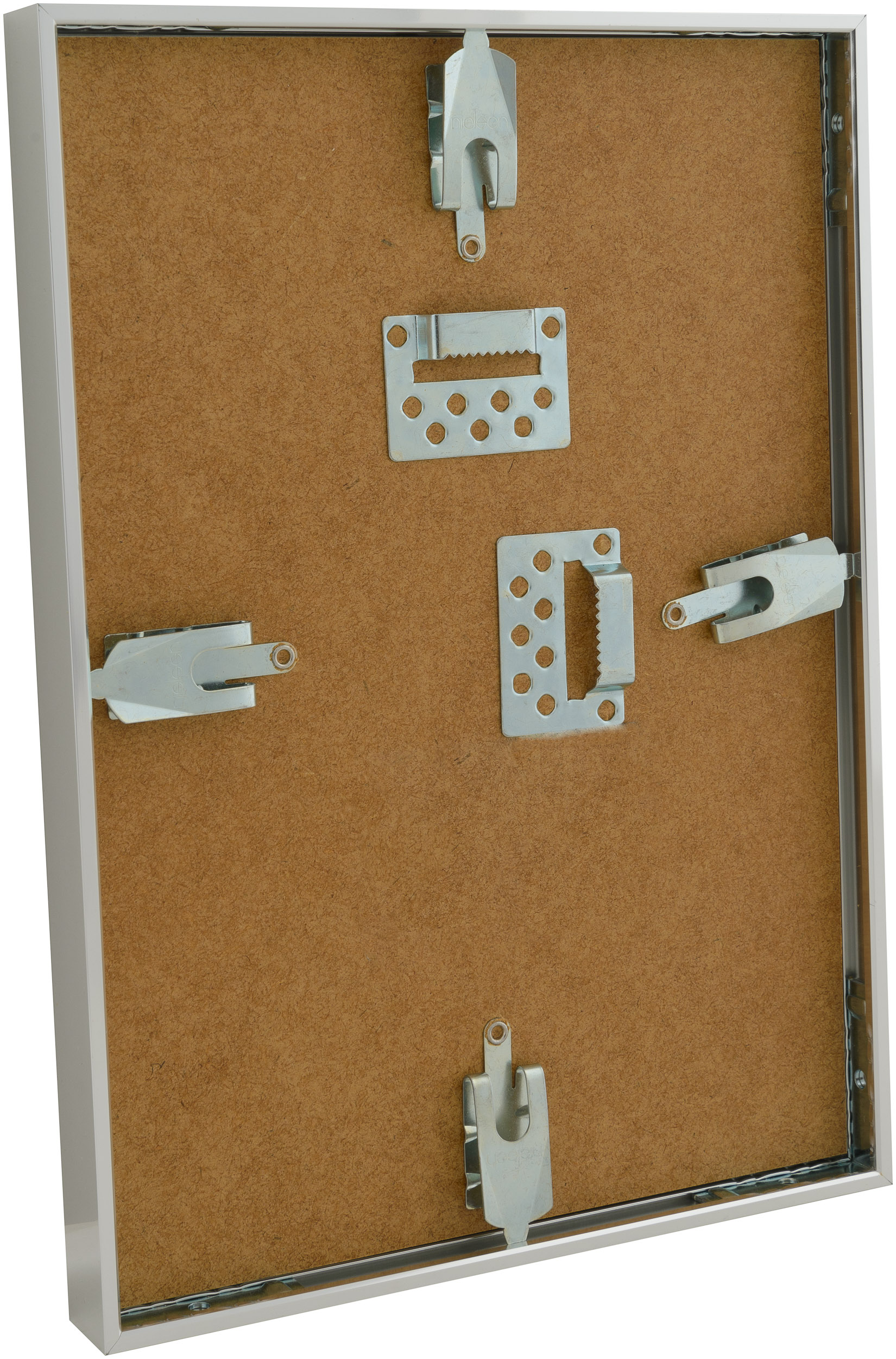 Stilvoller, glänzender, silberfarbener Rahmen von hoher Qualität, hergestellt in Deutschland mit einer dünnen Rahmenleiste aus Aluminium. Das minimalistische Design des Bilderrahmens passt gut in einen schlichten Einrichtungsstil und die dezente hellgraue Silberfarbe eignet sich genauso gut für Fotos und Poster. Die große Auswahl an Größen macht den Bilderrahmen perfekt für eine Bildercollage, bei der die Bildersammlung optisch zusammengehalten wird, indem du ähnliche Bilderrahmen wählst.