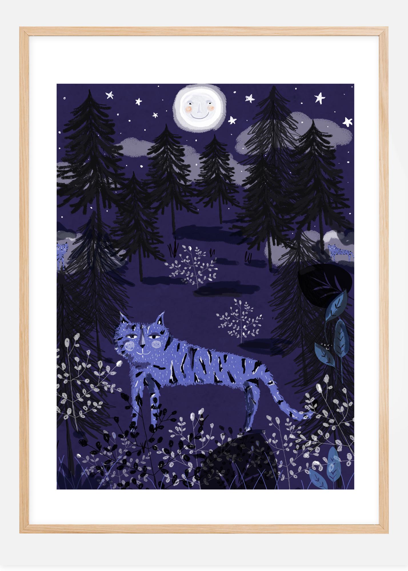 Ein lustiger Druck eines nächtlichen Waldes mit einem lächelnden Mond und einem Tiger. Der violette Himmel ist mit Wolken und glitzernden Sternen bedeckt. Im Hintergrund ragen die Pinienbäume empor, während der Mond auf sie herabblickt. Die dunklen Mauve- und Grüntöne sorgen für eine warme Atmosphäre, während die kleinen weißen Büsche dem Bild ein wenig mehr Licht verleihen. Ein perfekter Druck für Ihr Kinderzimmer.