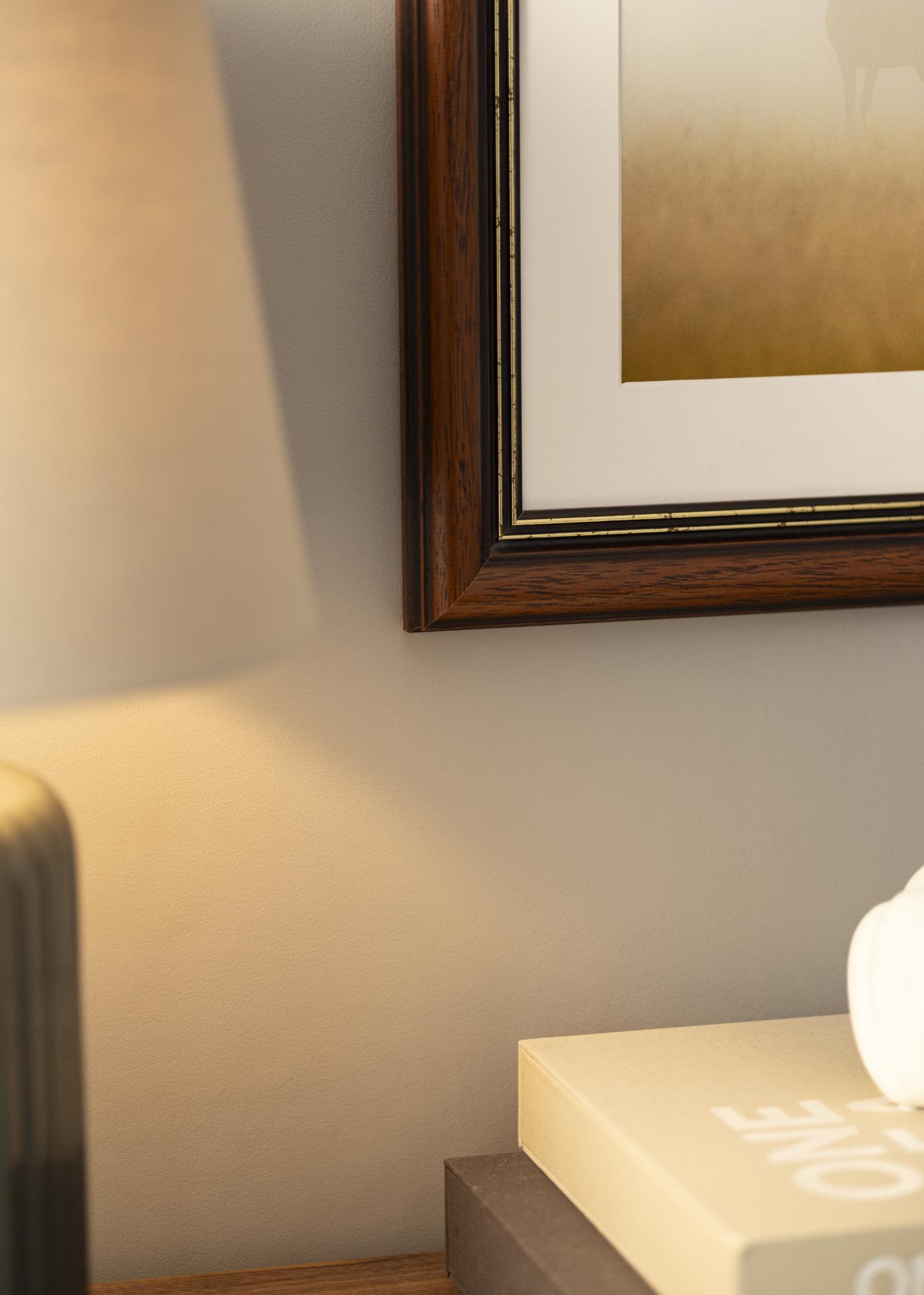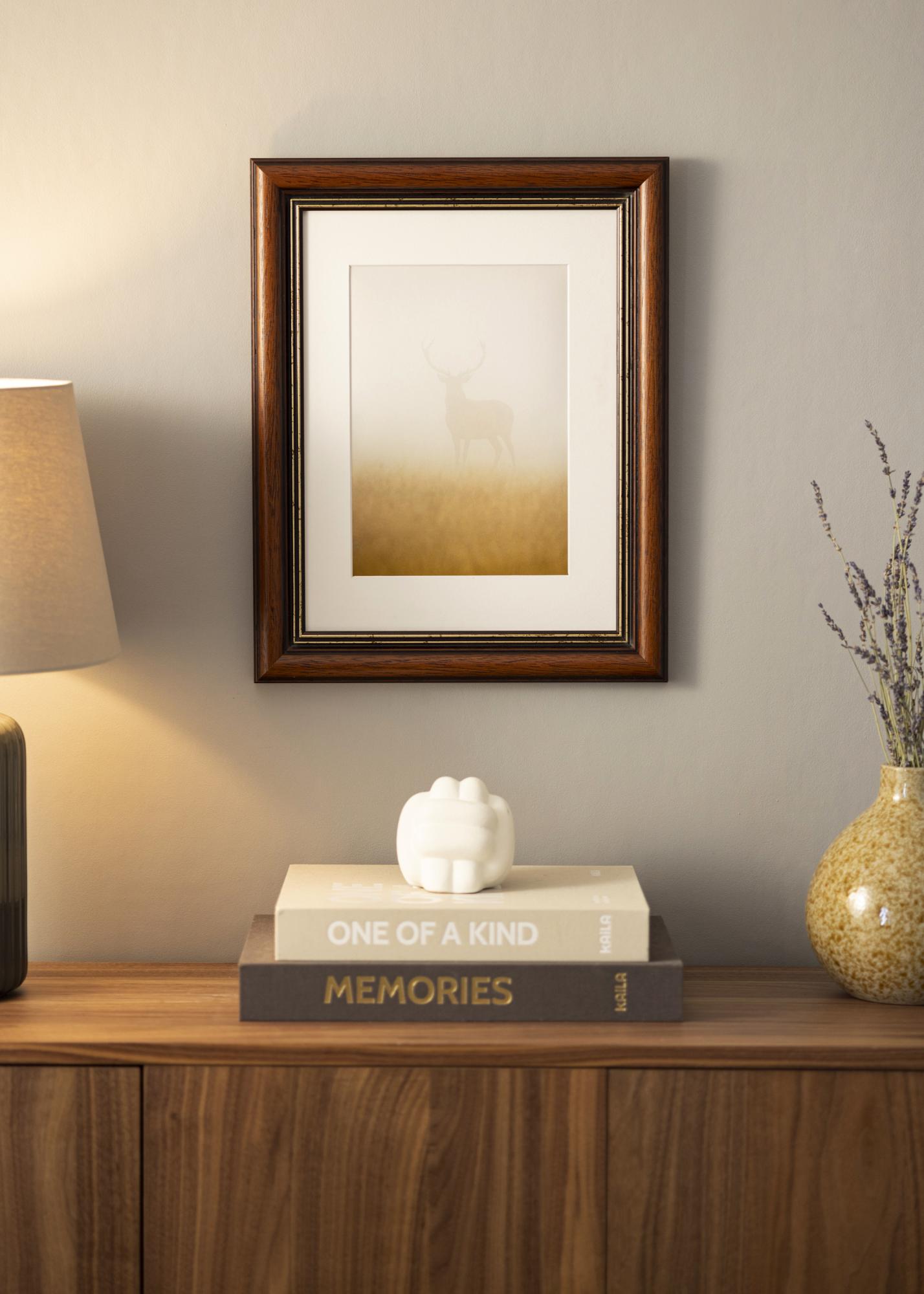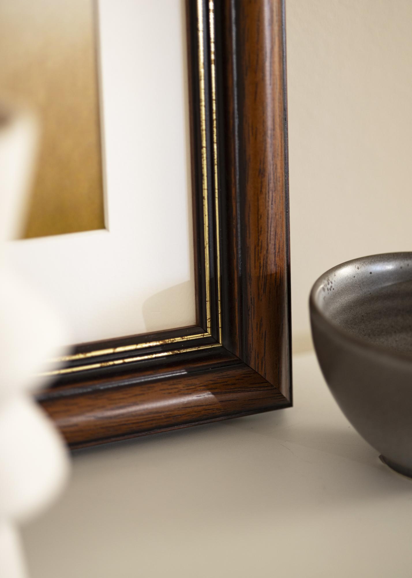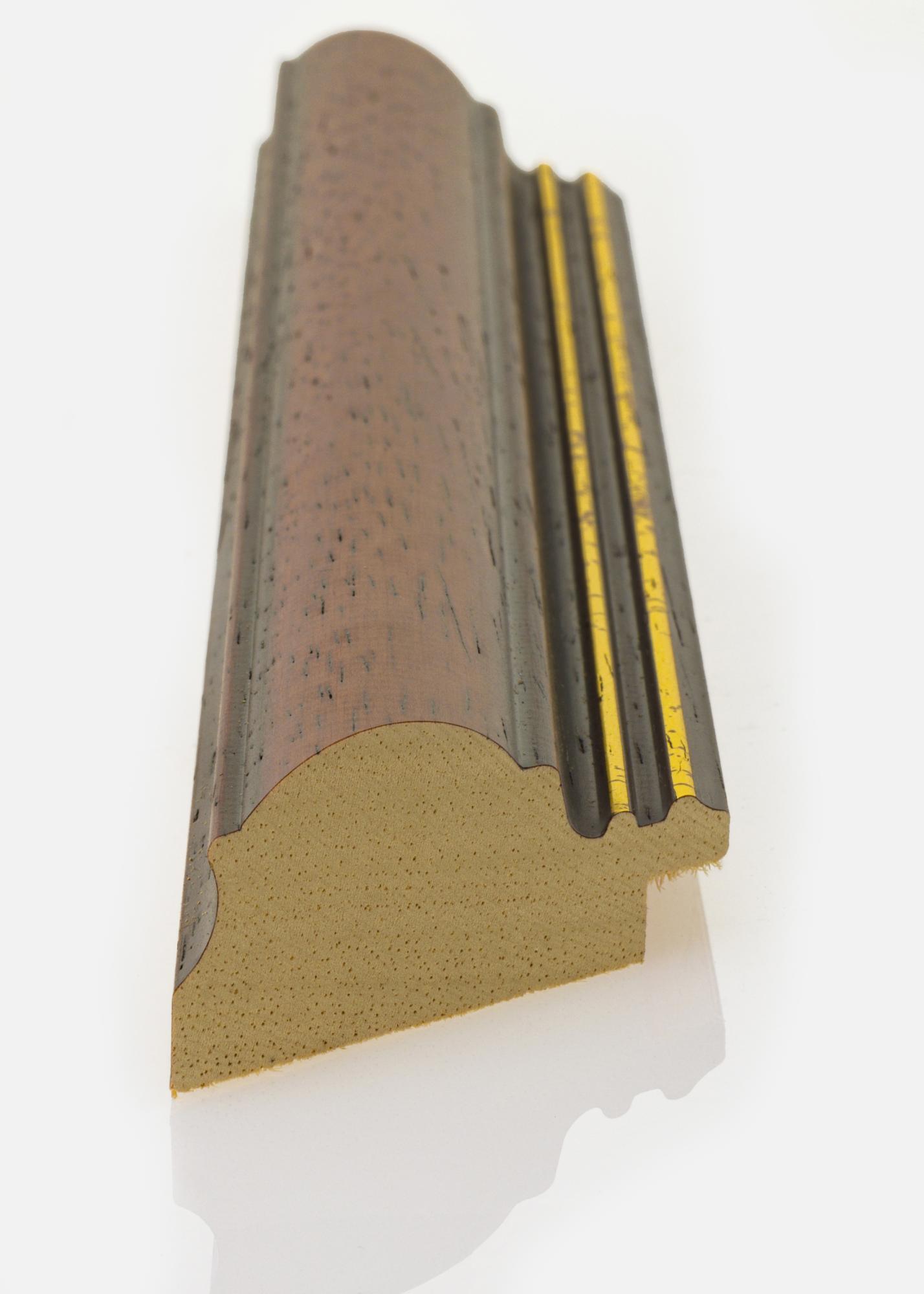 Orsa ist ein Fotorahmen im klassischen Stil mit einem breiten abgerundeten Profil. Die Grundfarbe des Bilderrahmens ist braun, kombiniert mit schwarzen Elementen und zwei goldfarbenen Linien, die neben dem Motiv verlaufen.