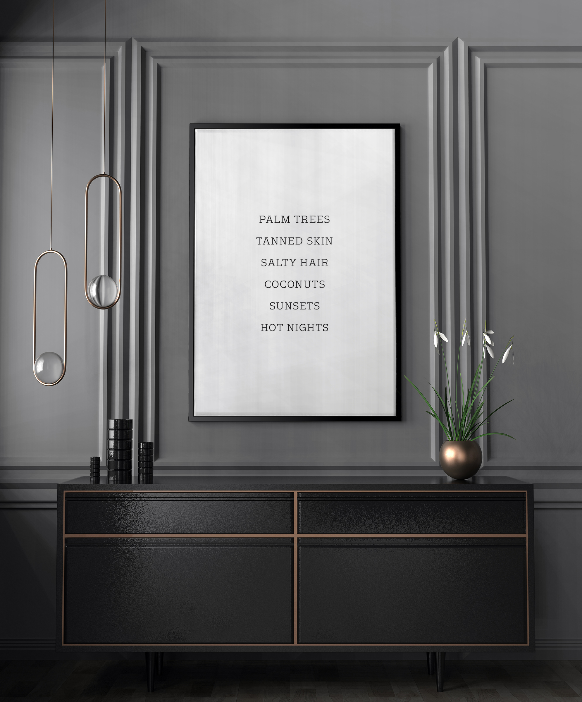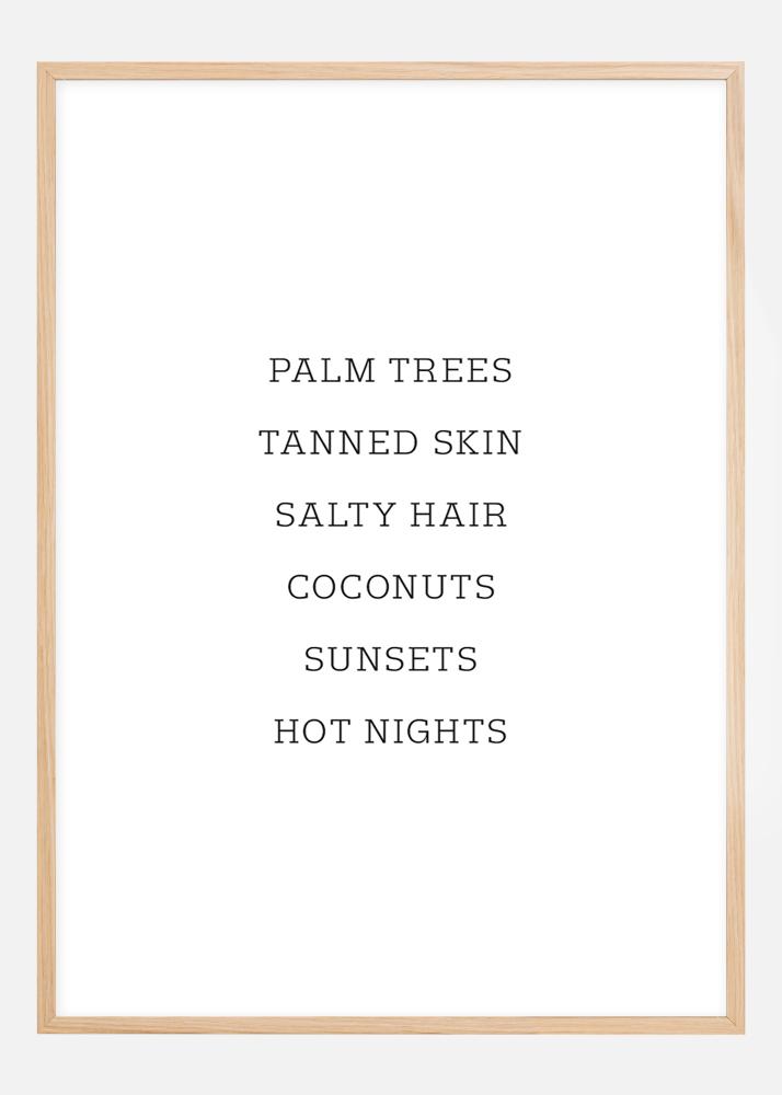 Ein schwarz-weißer Druck, der eine sommerliche Botschaft vermittelt. In schwarzer Schrift auf weißer Fläche stehen die Worte: PALMEN, GEBRÄUNTE HAUT, SALZIGES HAAR, KOKOSNÜSSE, SONNENUNTERGÄNGE, HEISSE NÄCHTE. Die mittig angeordneten Wörter erinnern uns an die Sommersaison. Bringen Sie mit diesem Druck einen Hauch von Sommer in Ihr modernes Wohnzimmer.