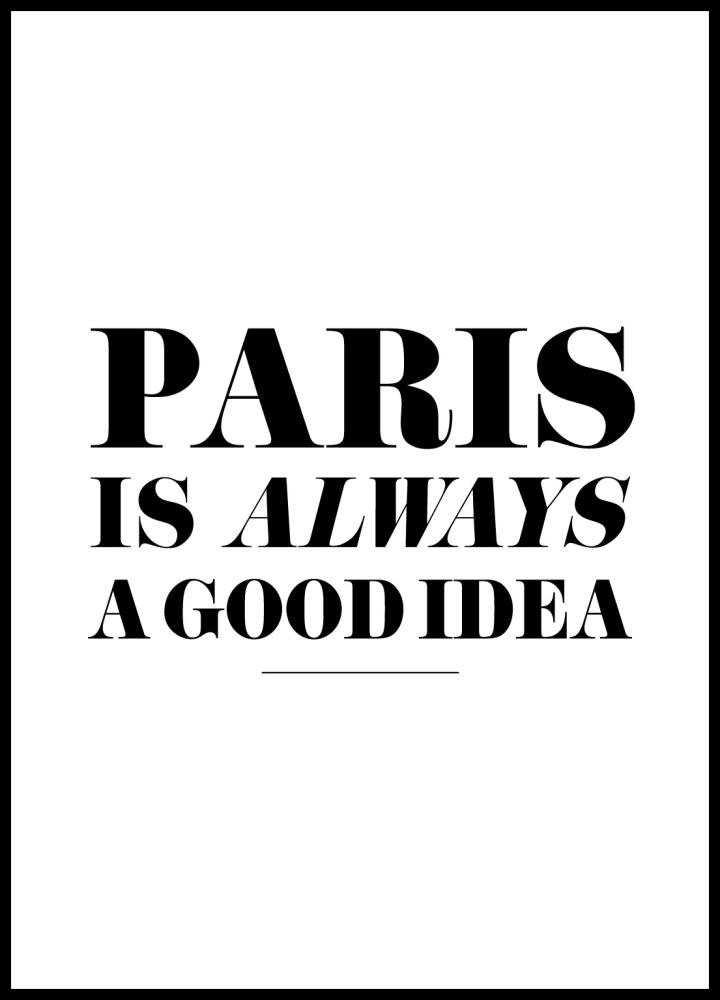 Der Regen prasselt auf Ihr Bürofenster, und der Text auf Ihrem Computer verschwimmt zu einer einzigen schwarzen Masse. Durch Ihren Körper kriecht Langeweile, und weder ein Beinstrecker noch ein Kaffee helfen. Aber dann werfen Sie ein Auge auf das kleine Bild auf Ihrem Schreibtisch und das lästige Gefühl verwandelt sich in eine Träumerei. Sie können immer für ein langes Wochenende nach Paris! Auf diesem schönem Poster ist der Text Text „Paris is always a good idea“ in schwarzen Buchstaben auf einem weißen Grund gedruckt. Stellen Sie dieses Posterso wie es ist auf, oder rahmen Sie es mit einem unserer hochwertigen Bilderrahmen. Da dieses Poster in verschiedenen Formaten erhältlich ist, so können Sie sicher sein, dass Sie eines in der passenden Größe finden.