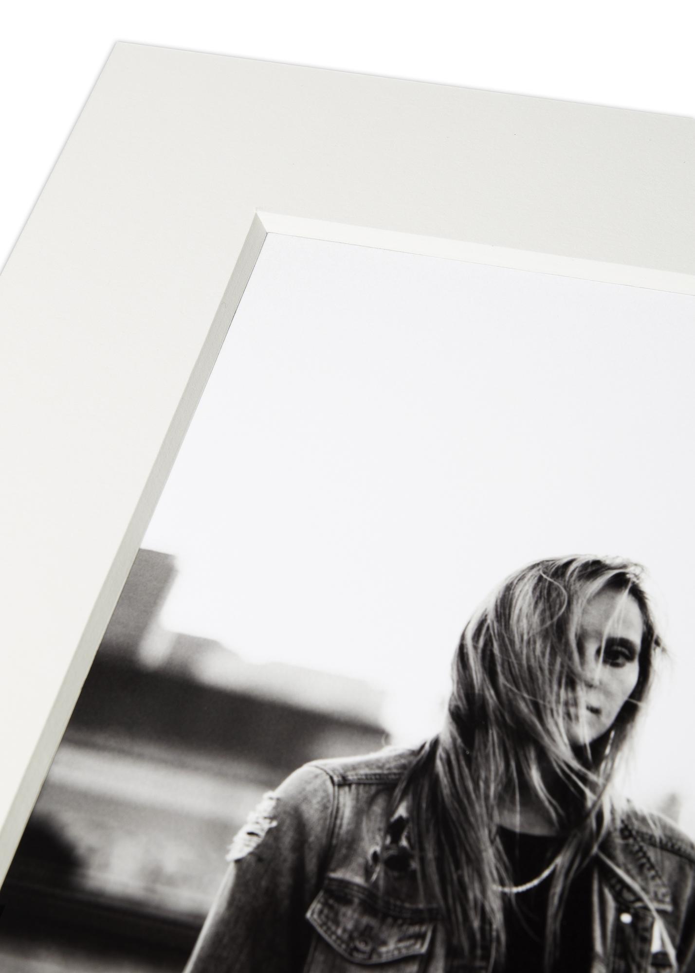 Dieses weiße Passepartout fertigen wir auf Bestellung in unserer eigenen Werkstatt – entsprechend Ihren Wünschen bezüglich der Abmessungen. Das Passepartout ist sowohl säurefrei als auch PH-neutral, und das Material stammt aus nachhaltiger Forstwirtschaft.